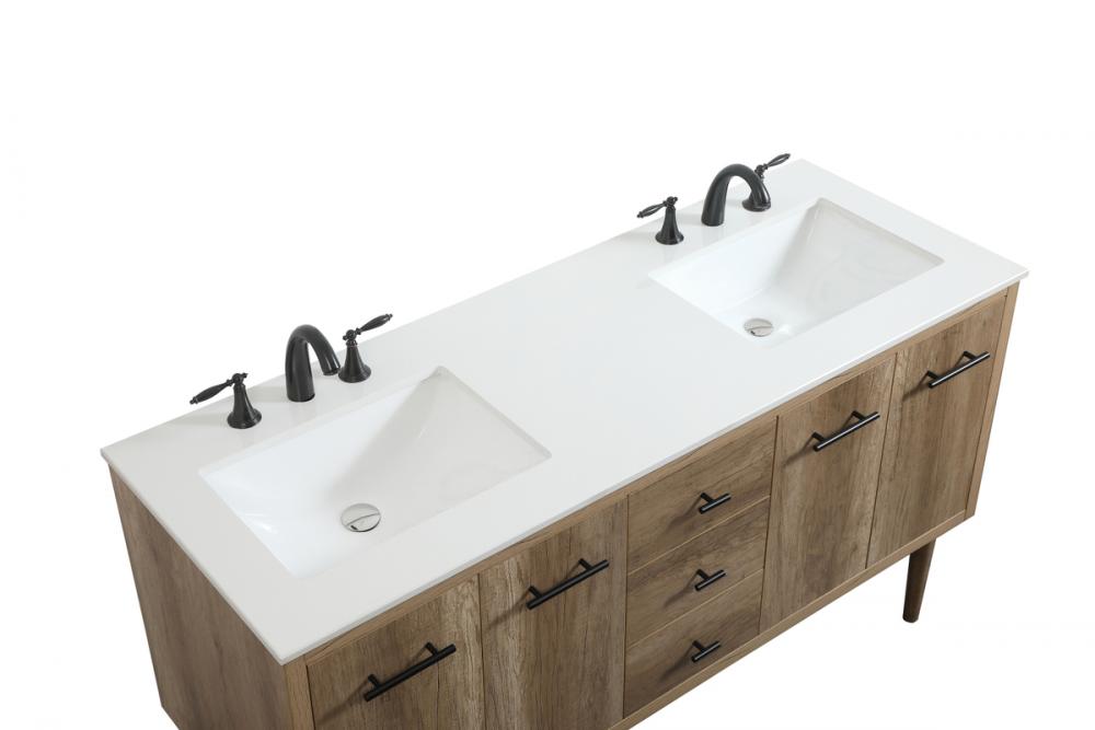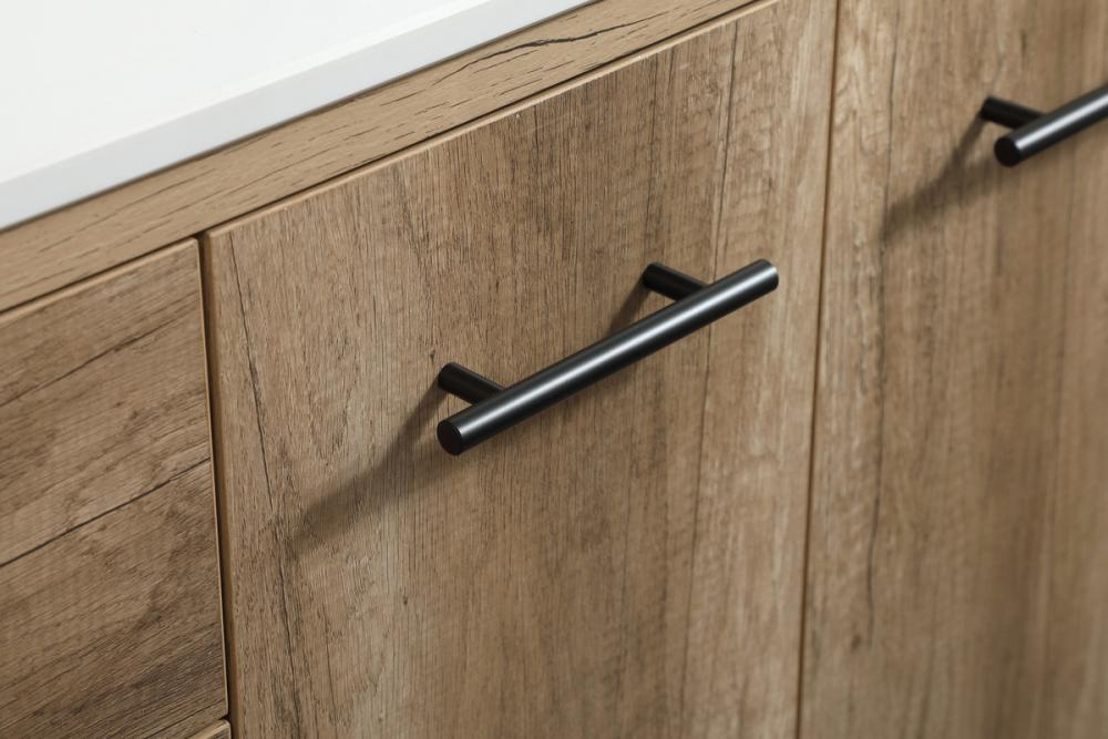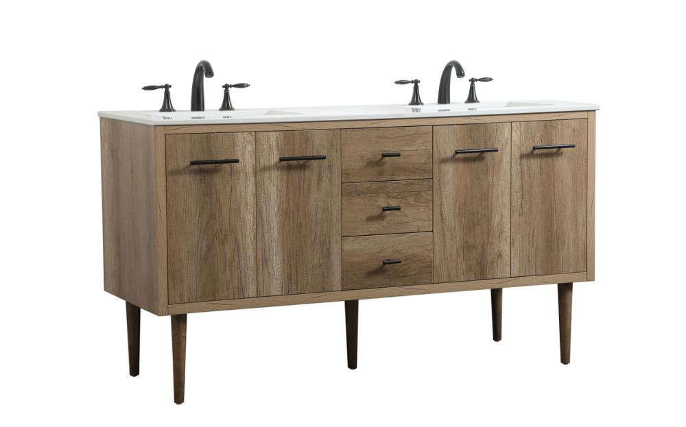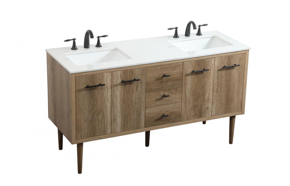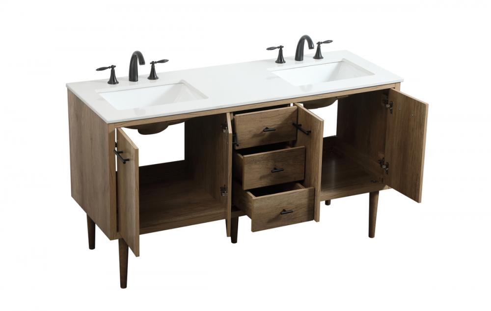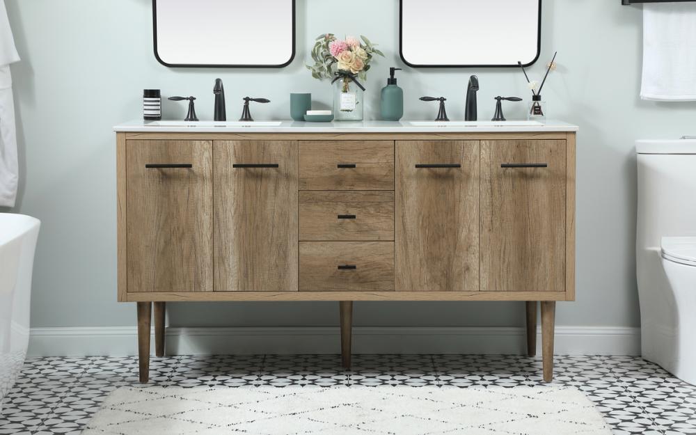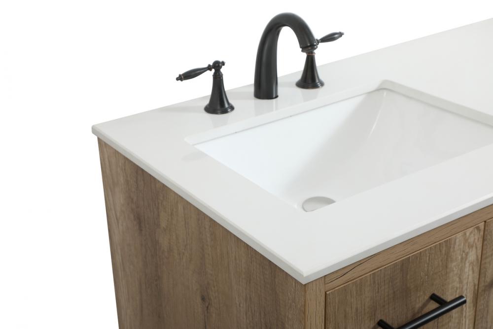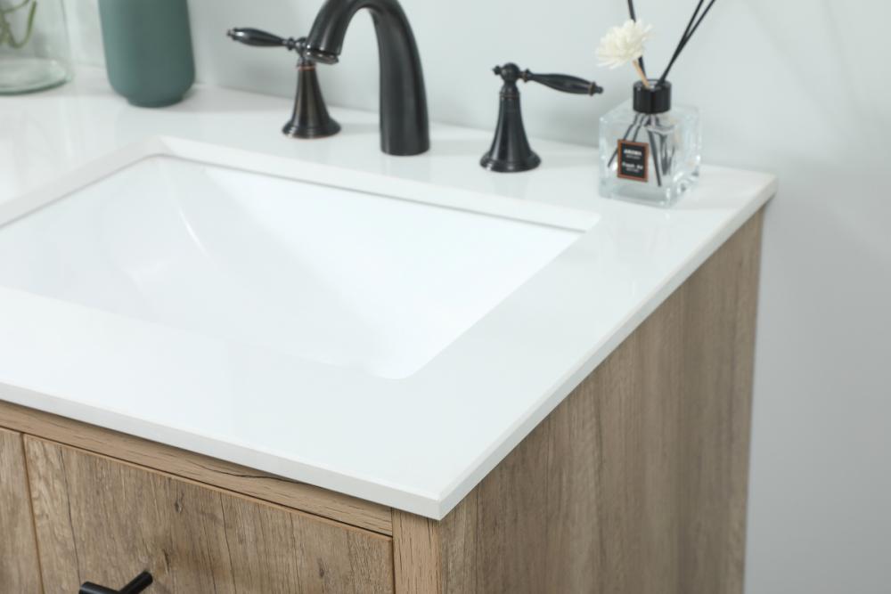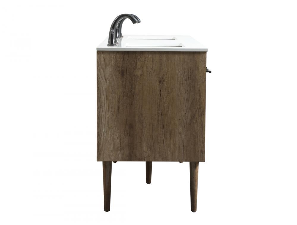 Delve into a world of minimalistic fashion and contemporary styling with this midcentury modern vanity. The clean lines anchors the design, while the straight tapered cylinder legs add subtle interest. Bar pull handle adorns the soft closing door hiding the base of the rectangular porcelain sink and letting you store your bathroom necessities and toiletries. Three soft closing drawers add plenty of storage option. Whether you want to use this as a floating vanity or a freestanding vanity, the choice is yours. The durable ivory white engineered marble countertop complements the manufactured wood base vanity and is built to last.