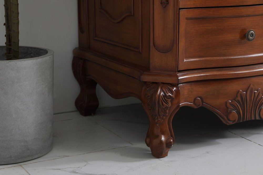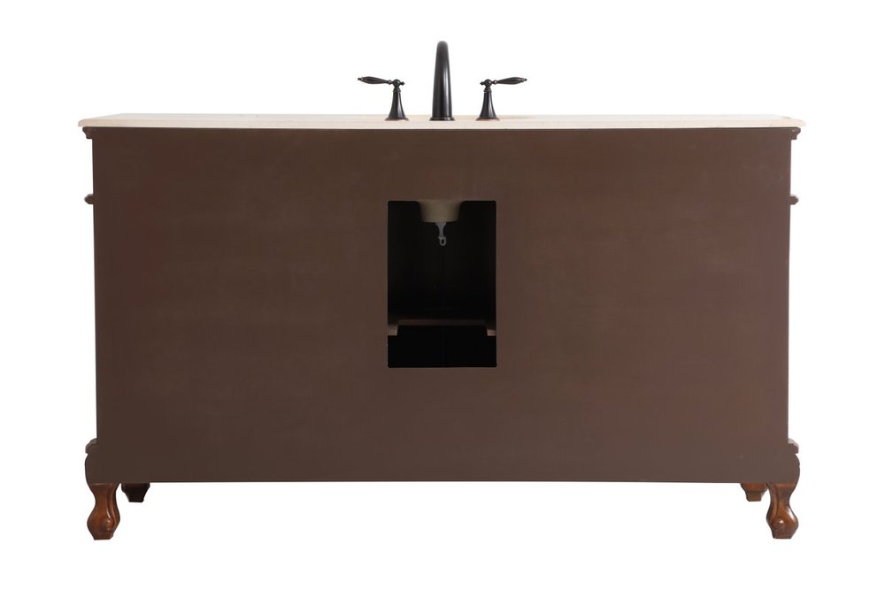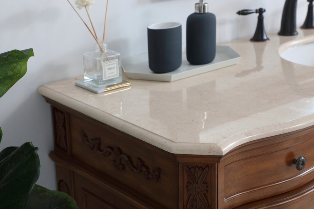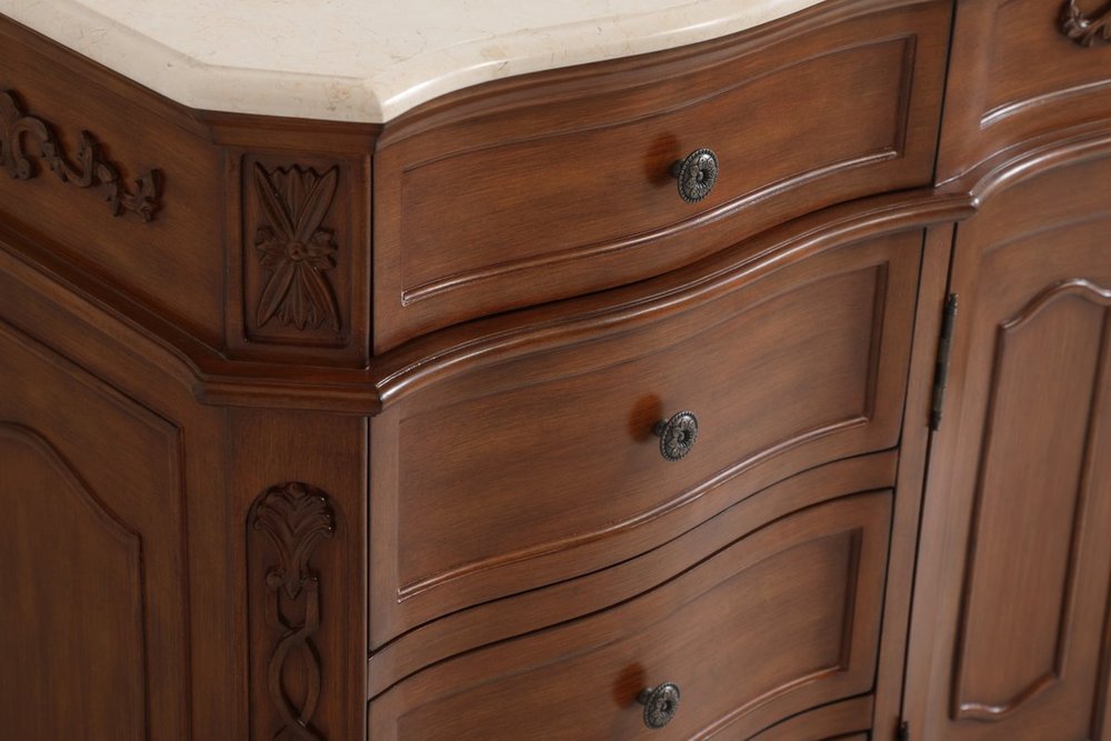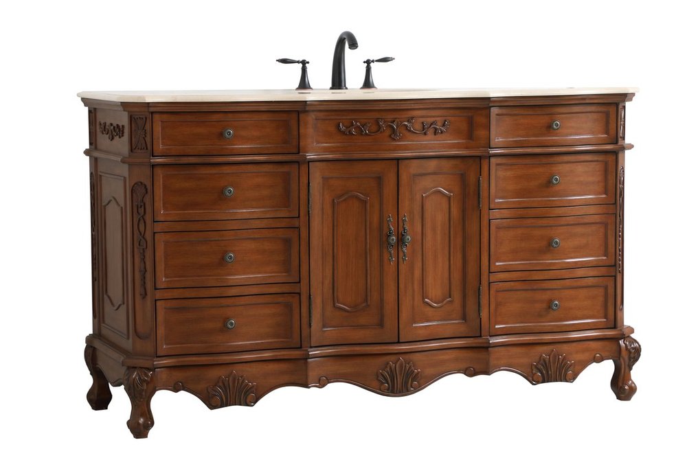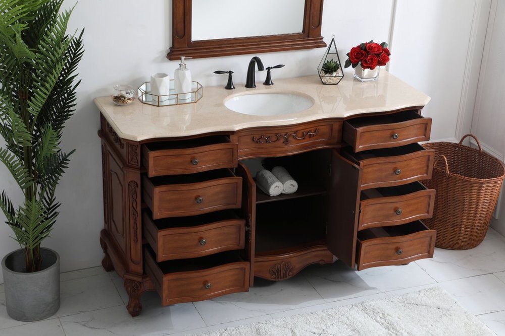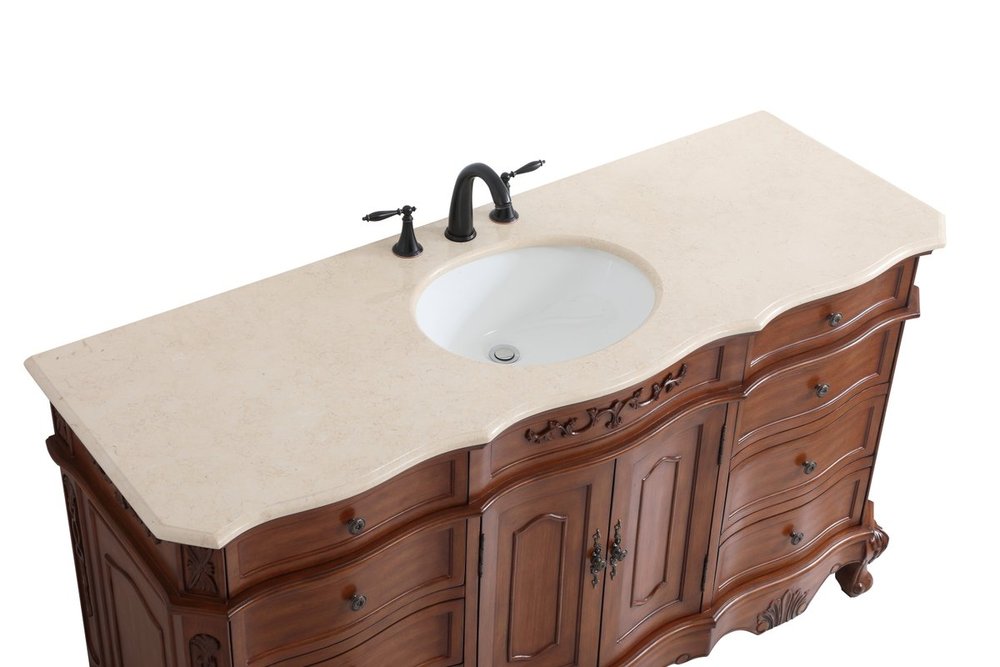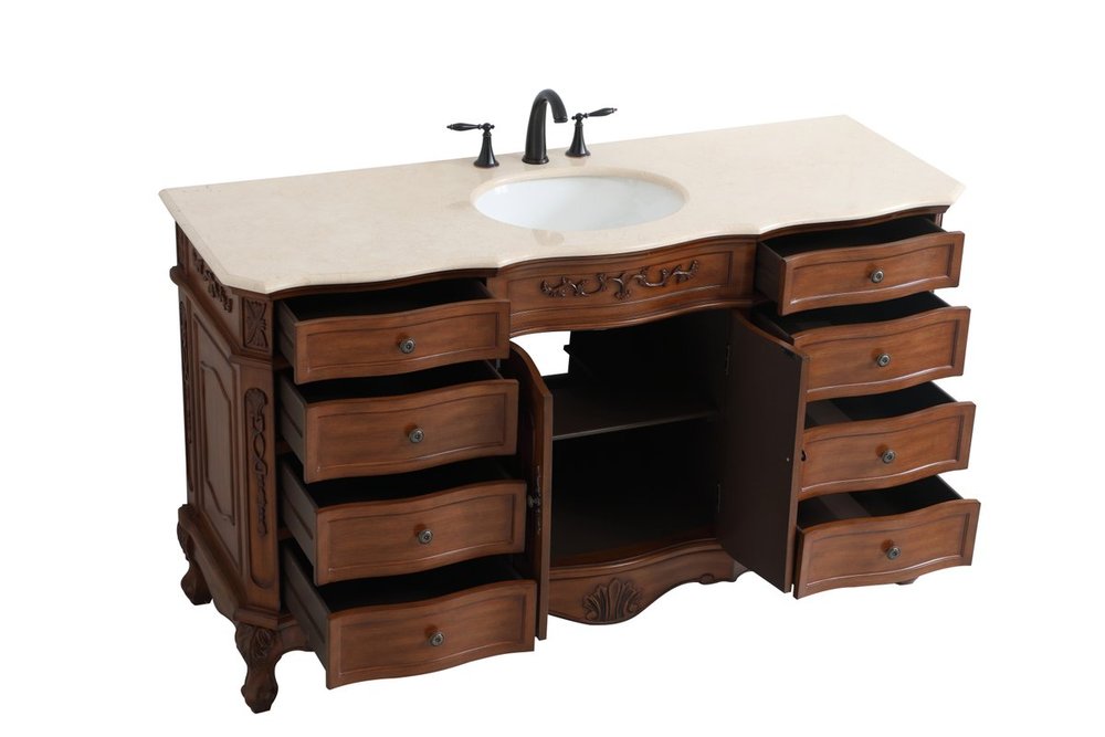 The Danville collection 60" vanity in a teak finish brings about traditional beauty. Decorated with ornate filigrees and engravings throughout, your bathroom or powder room will exude refined beauty. Don't let the design fool you, the cream marble countertop and porcelain undermount sink allows for ample space to get ready, while the antique bronze hardware allows you to discover storage spaces with ease. The simple knobs allows you to glide the 8 side drawers out, while the ornate knobs help you open the two center cabinet doors. You and your guests will marvel at this vanity that will both store away your bathroom essentials and enhance the aesthetics of your room.