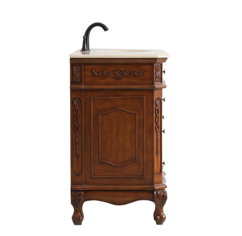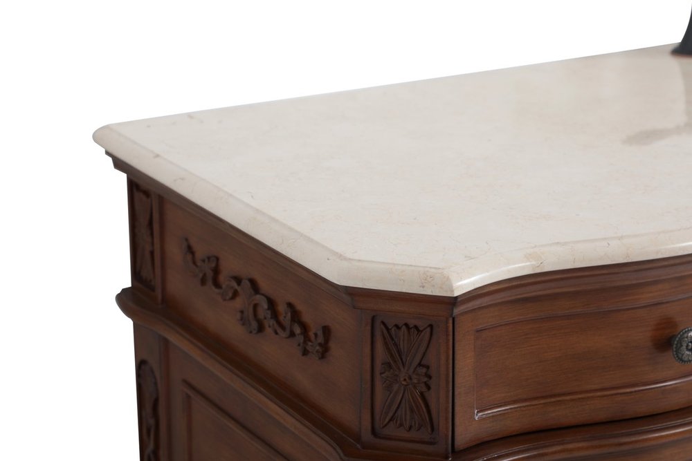 Distressed teak finish with a luxurious cream marble countertop