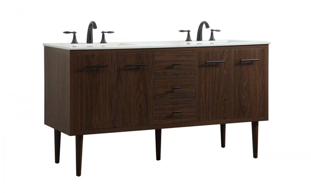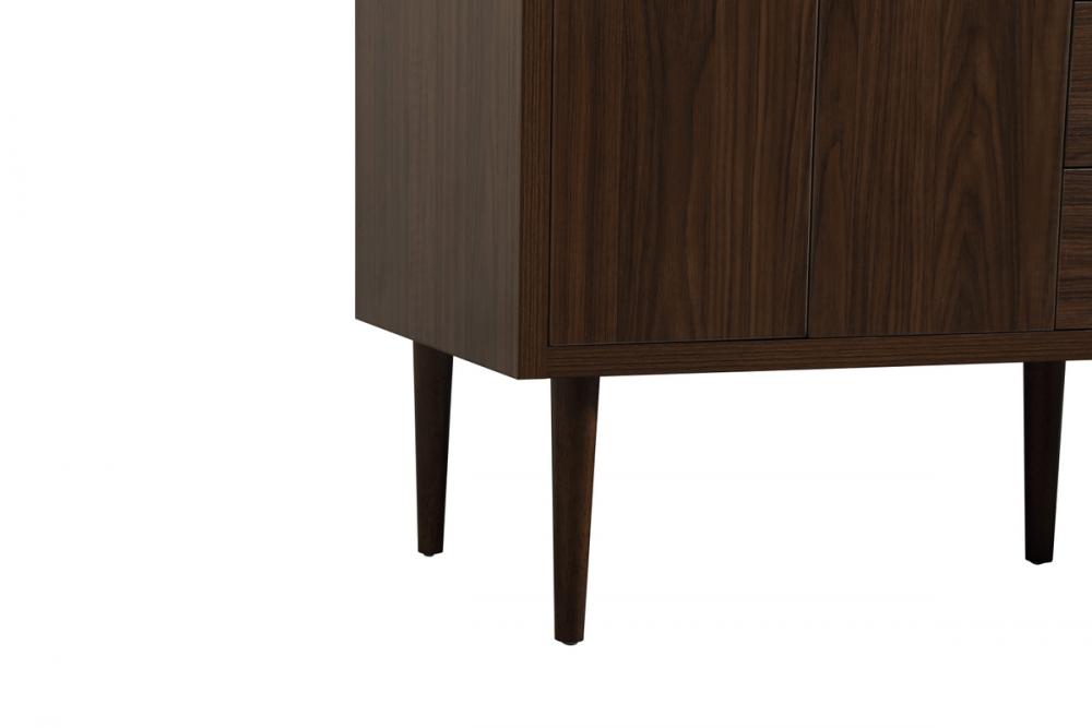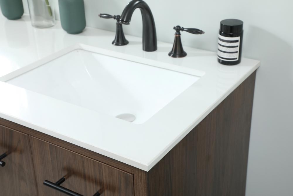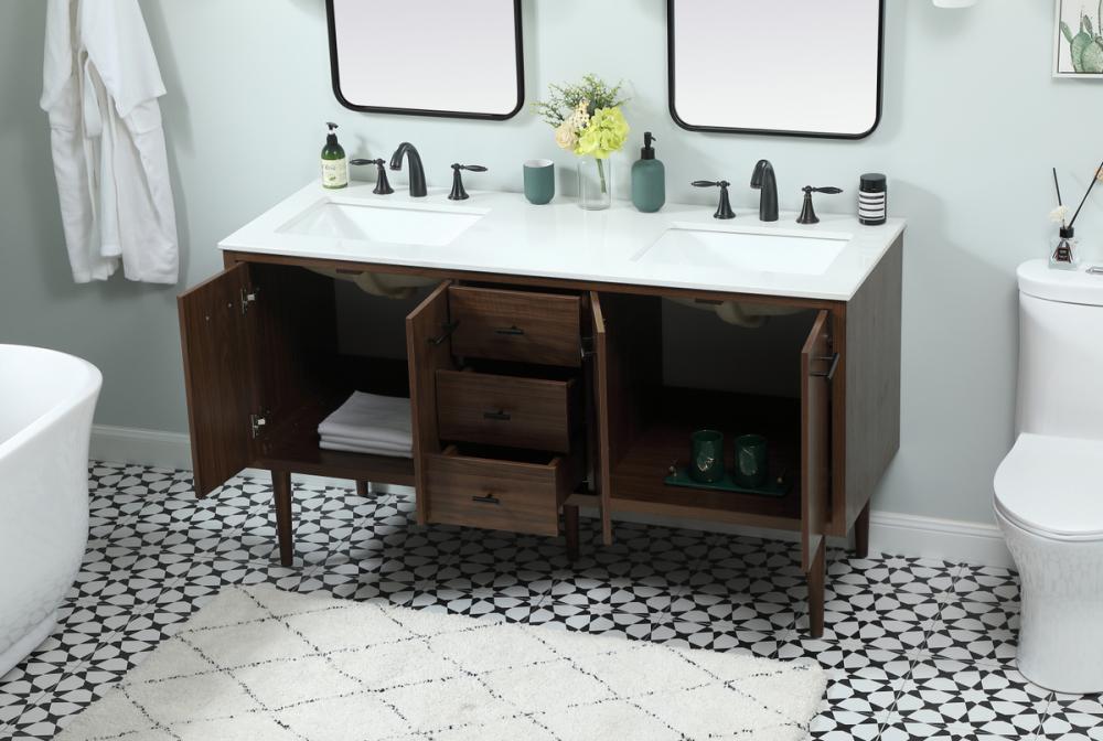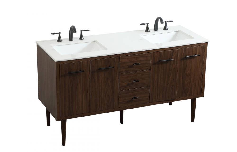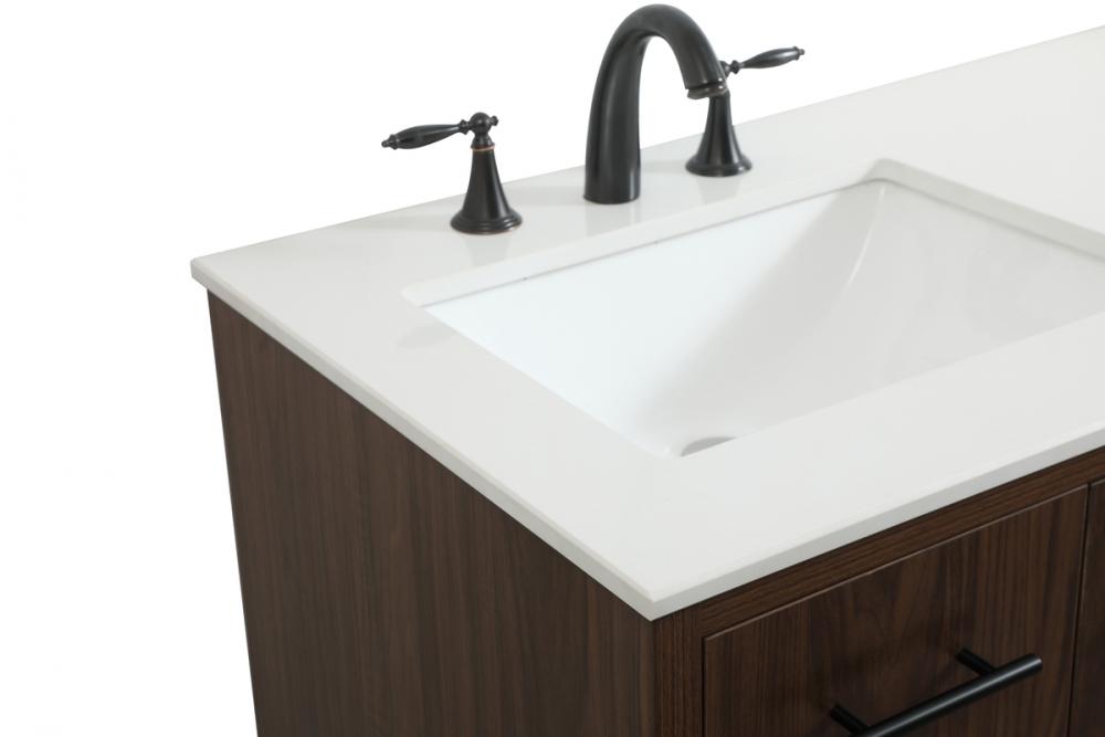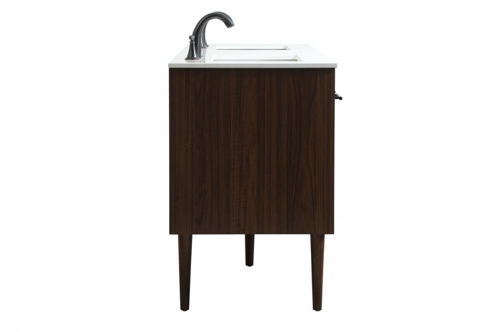 Delve into a world of minimalistic fashion and contemporary styling with this midcentury modern vanity. The clean lines anchors the design, while the straight tapered cylinder legs add subtle interest. Bar pull handle adorns the soft closing door hiding the base of the rectangular porcelain sink and letting you store your bathroom necessities and toiletries. Three soft closing drawers add plenty of storage option. Whether you want to use this as a floating vanity or a freestanding vanity, the choice is yours. The durable ivory white engineered marble countertop complements the manufactured wood base vanity and is built to last.