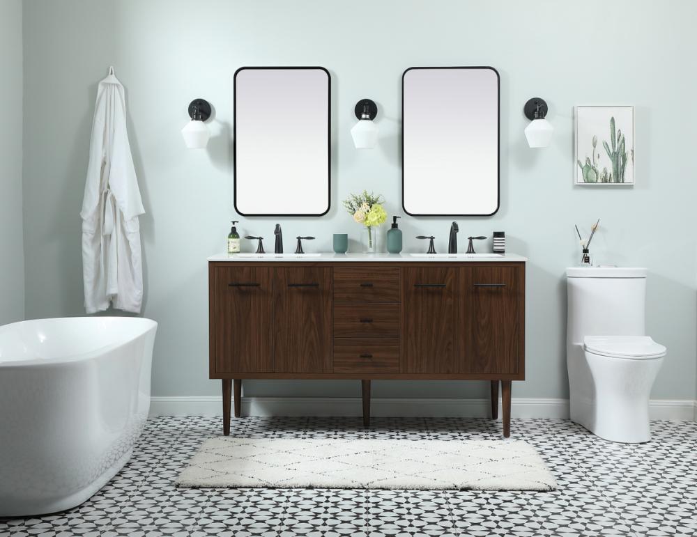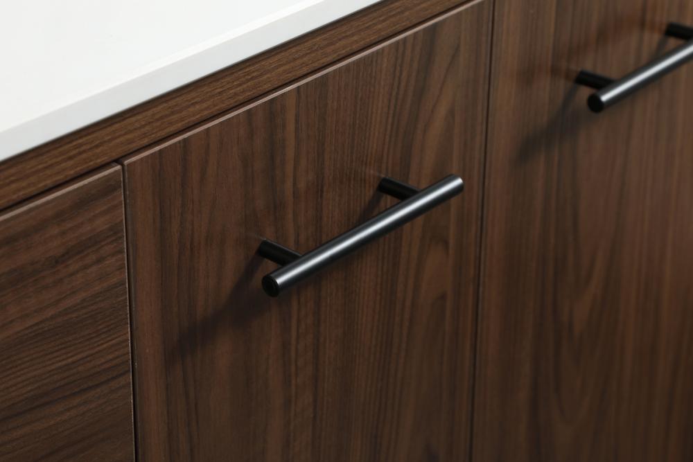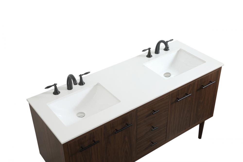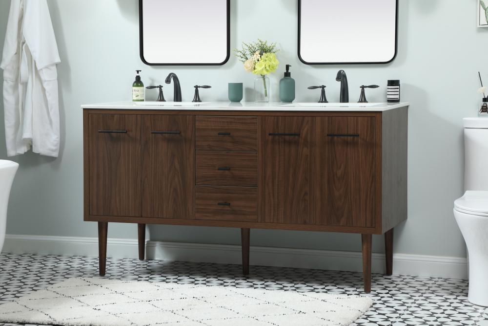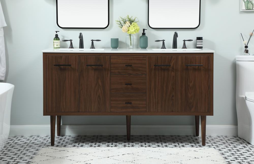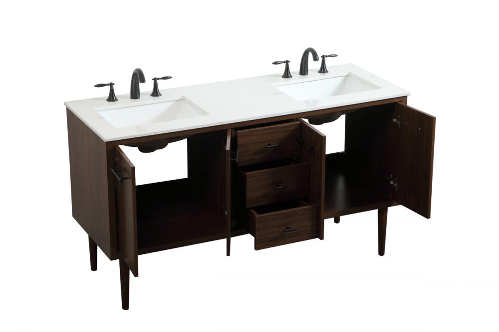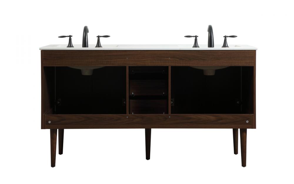 Delve into a world of minimalistic fashion and contemporary styling with this midcentury modern vanity. The clean lines anchors the design, while the straight tapered cylinder legs add subtle interest. Bar pull handle adorns the soft closing door hiding the base of the rectangular porcelain sink and letting you store your bathroom necessities and toiletries. Three soft closing drawers add plenty of storage option. Whether you want to use this as a floating vanity or a freestanding vanity, the choice is yours. The durable ivory white engineered marble countertop complements the manufactured wood base vanity and is built to last.