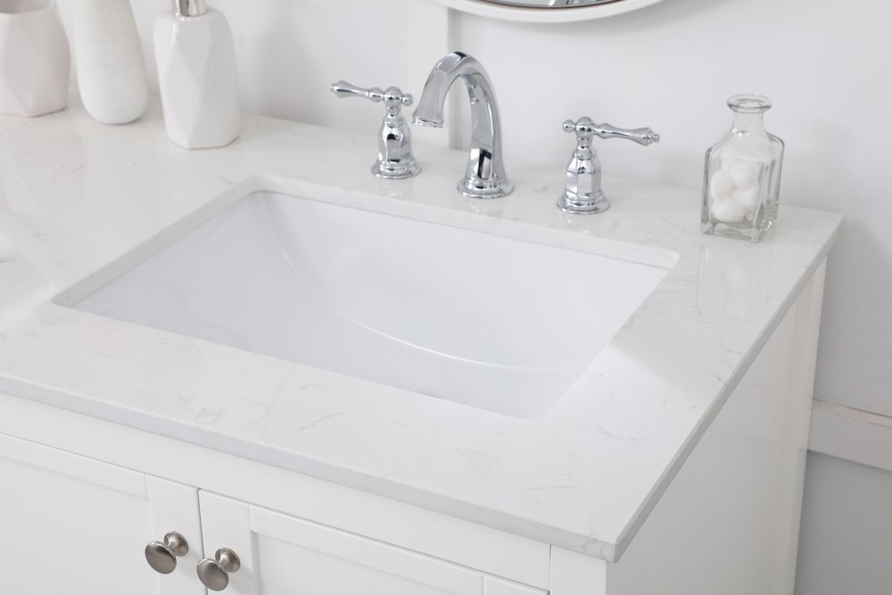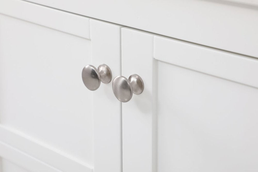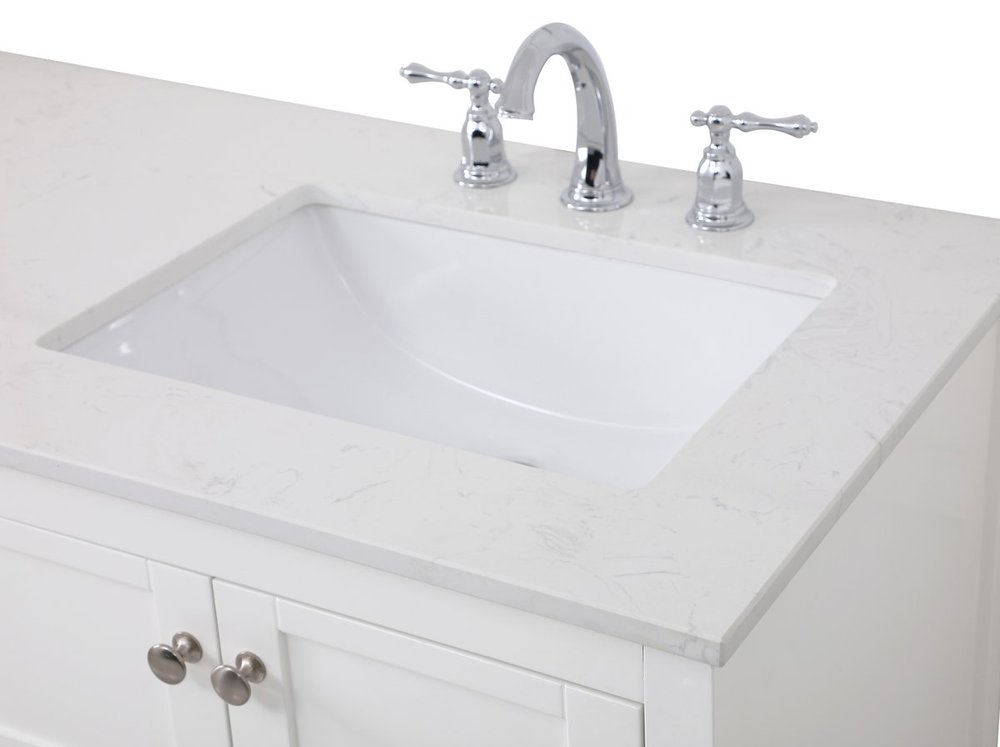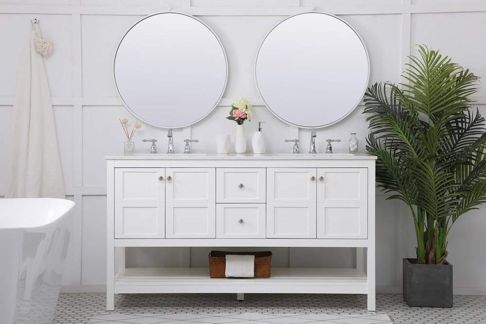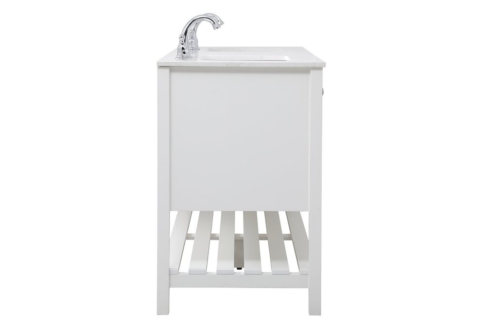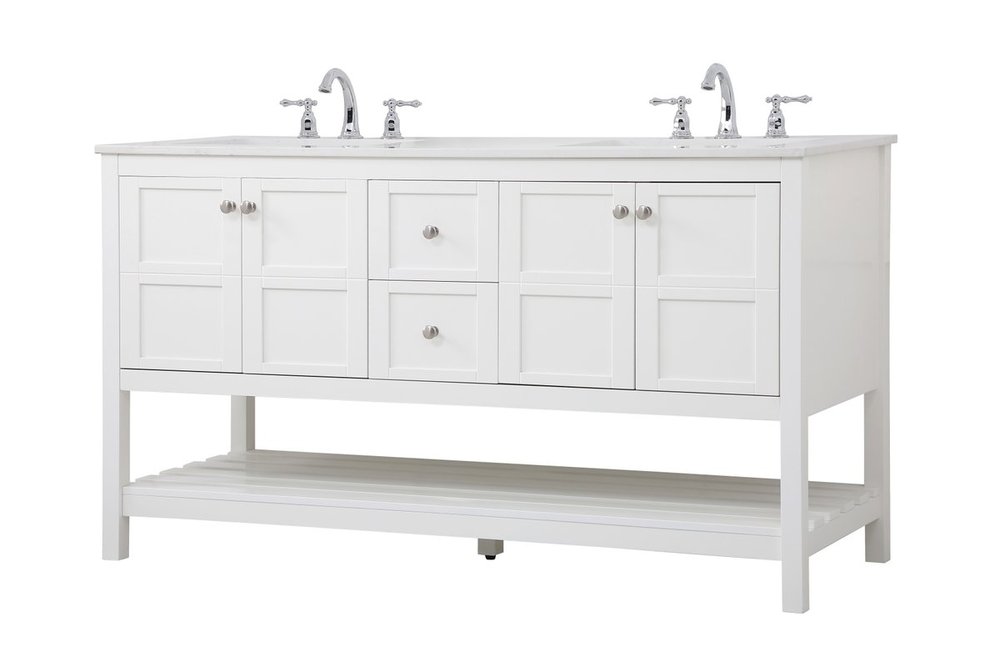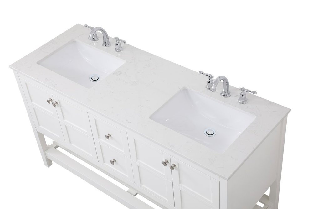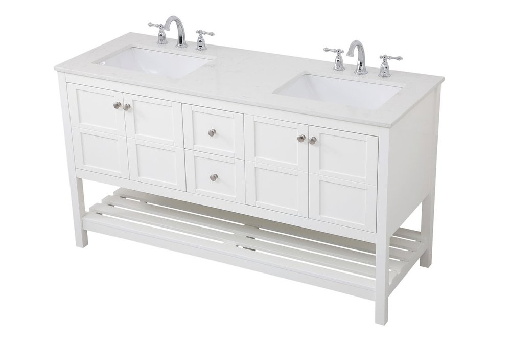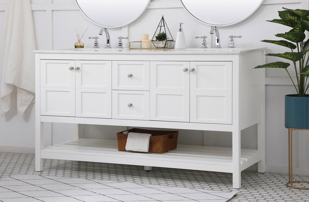 The subtle beauty of the Theo collection 60" vanity in a white finish exudes comfortable luxury. Its modern, yet traditional beauty will surely dress up your bathroom or powder room without any fuss. The white stone countertop and porcelain undermount sink shows quiet opulence, and the legs support upright without fail. Brushed Nickel hardware complements the trendy white finish, with pulls adorning the four cabinet doors and two drawers, showcasing ample storage space within. Slated shelf allows for additional space to organize your towels. Whether this vanity is in your bathroom or for guests, its presence will surely elevate the aesthetics of your room.
