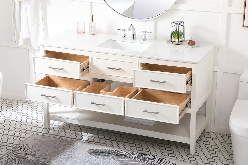 Make the most of your space with this traditional style bathroom vanity. Complements well with many aesthetics with its beautiful finish, calacatta engineered marble countertop, and the contemporary slender handle bar that sits on six functional drawers with soft closing mechanism, allowing you to store an assortment of bathroom essentials. The lower shelf makes it the perfect space to hold new towels for your guests. This compact vanity ensures both form and function in your bathroom or powder room for you and your guests.