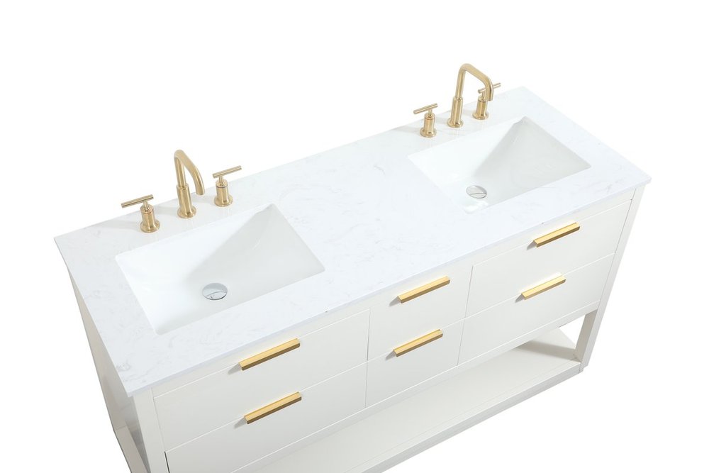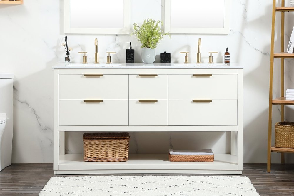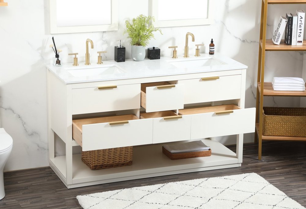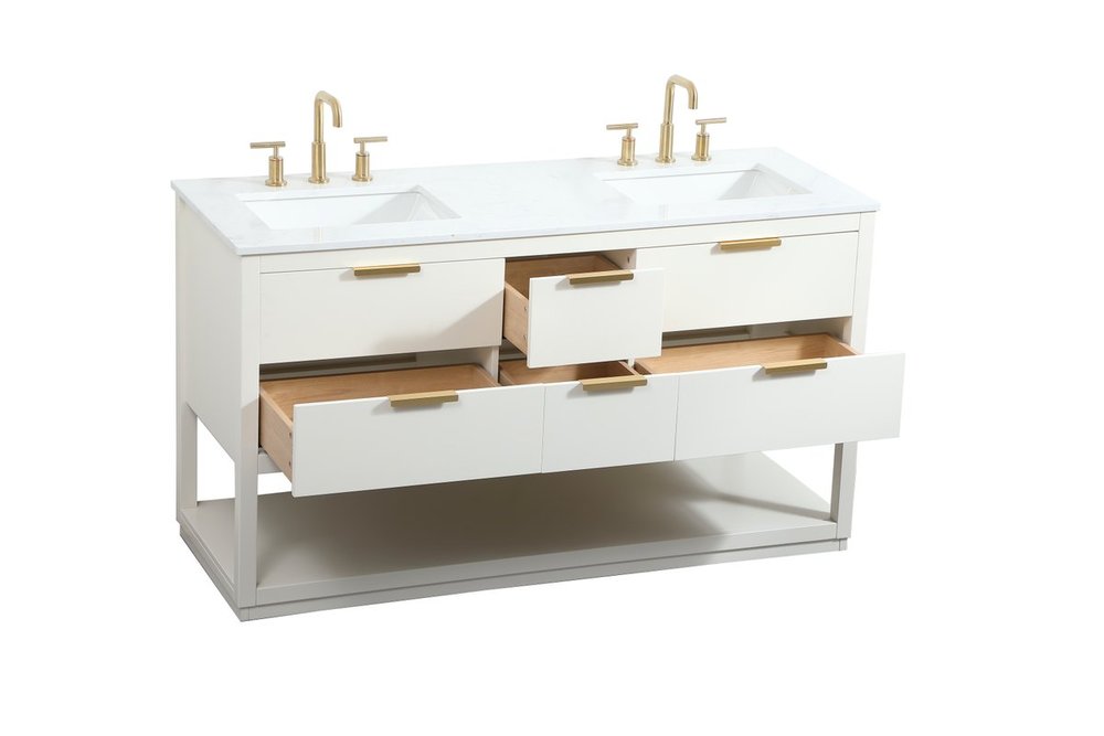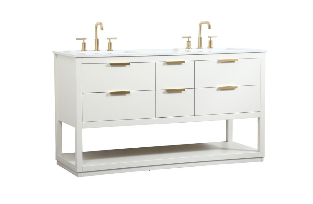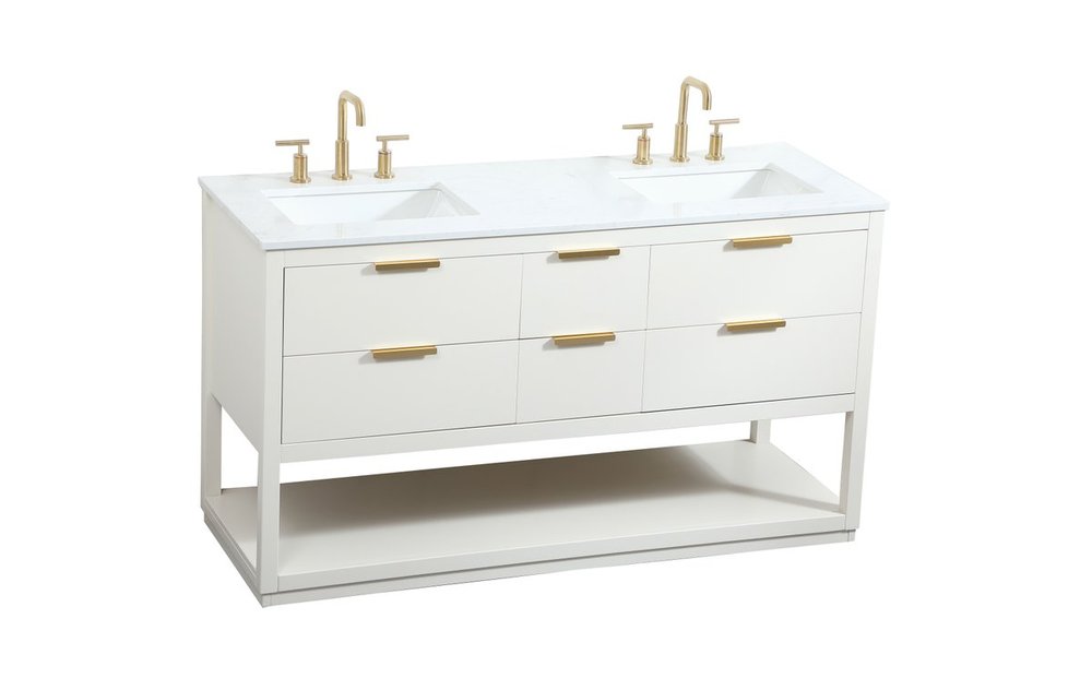 Live in modern comfort with this 60" white finish double vanity. Dressed in a white and sleek gold metal hardware, its contemporary style will have your bathroom or powder room elevated in modern sophistication. The open shelf at the base and five drawers reveal ample storage space for your bathroom essentials and miscellany. Clean lines create its own visual interest, adding trendy looks to your already chic room.