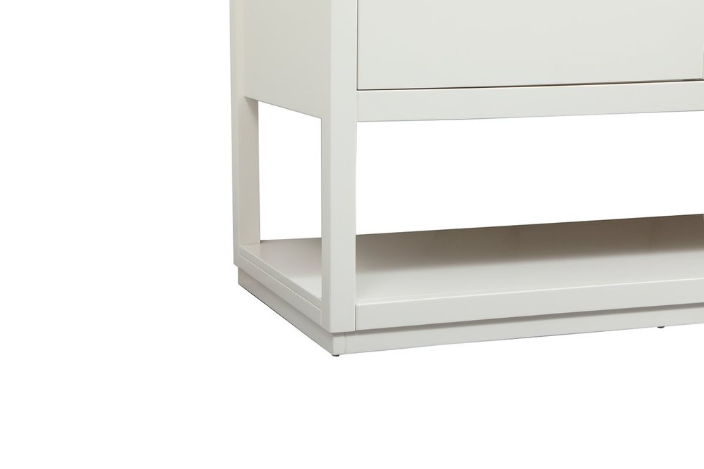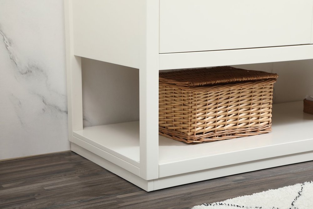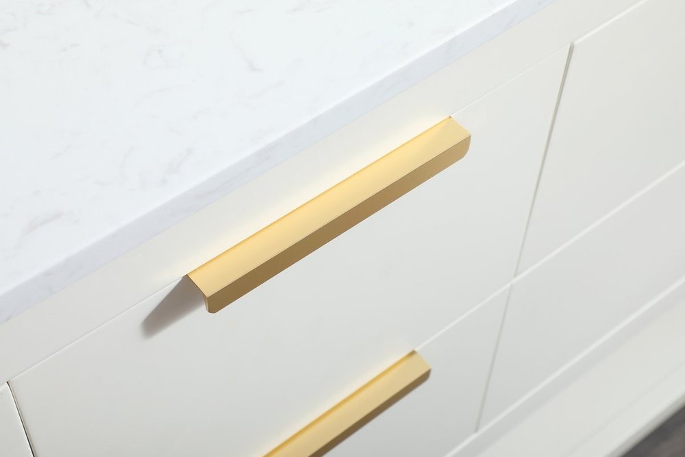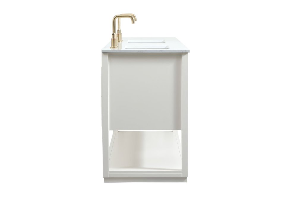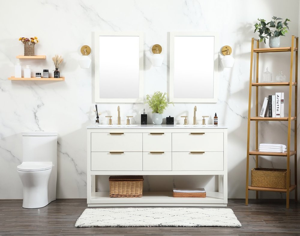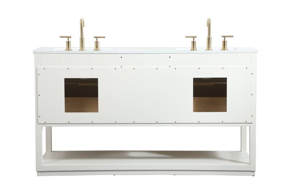 Live in modern comfort with this 60" white finish double vanity. Dressed in a white and sleek gold metal hardware, its contemporary style will have your bathroom or powder room elevated in modern sophistication. The open shelf at the base and five drawers reveal ample storage space for your bathroom essentials and miscellany. Clean lines create its own visual interest, adding trendy looks to your already chic room.