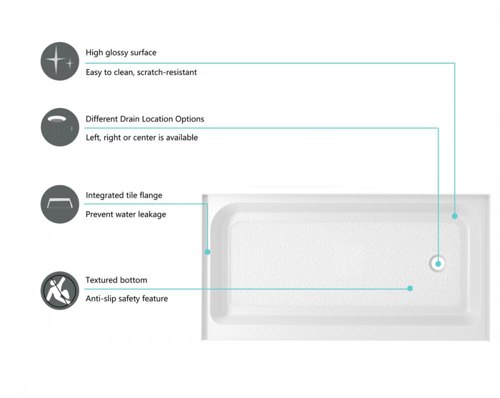The clean and modern rectangular shape of our shower base complements any bathroom décor, adding a touch of elegance to your space. with three drain location configurations ( left, right, and center) to choose from, this makes a perfect choice!