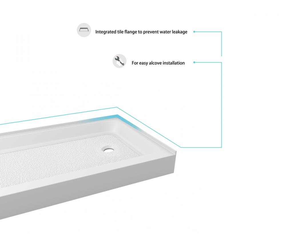 60x36 inch Single threshold shower tray right drain in glossy white