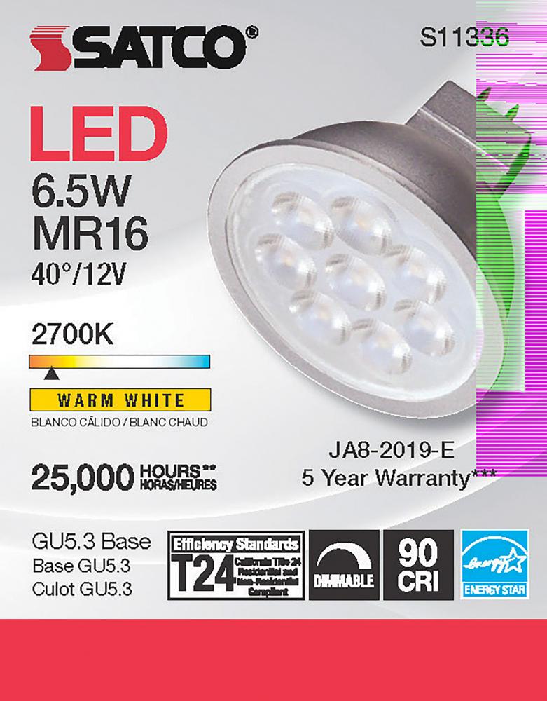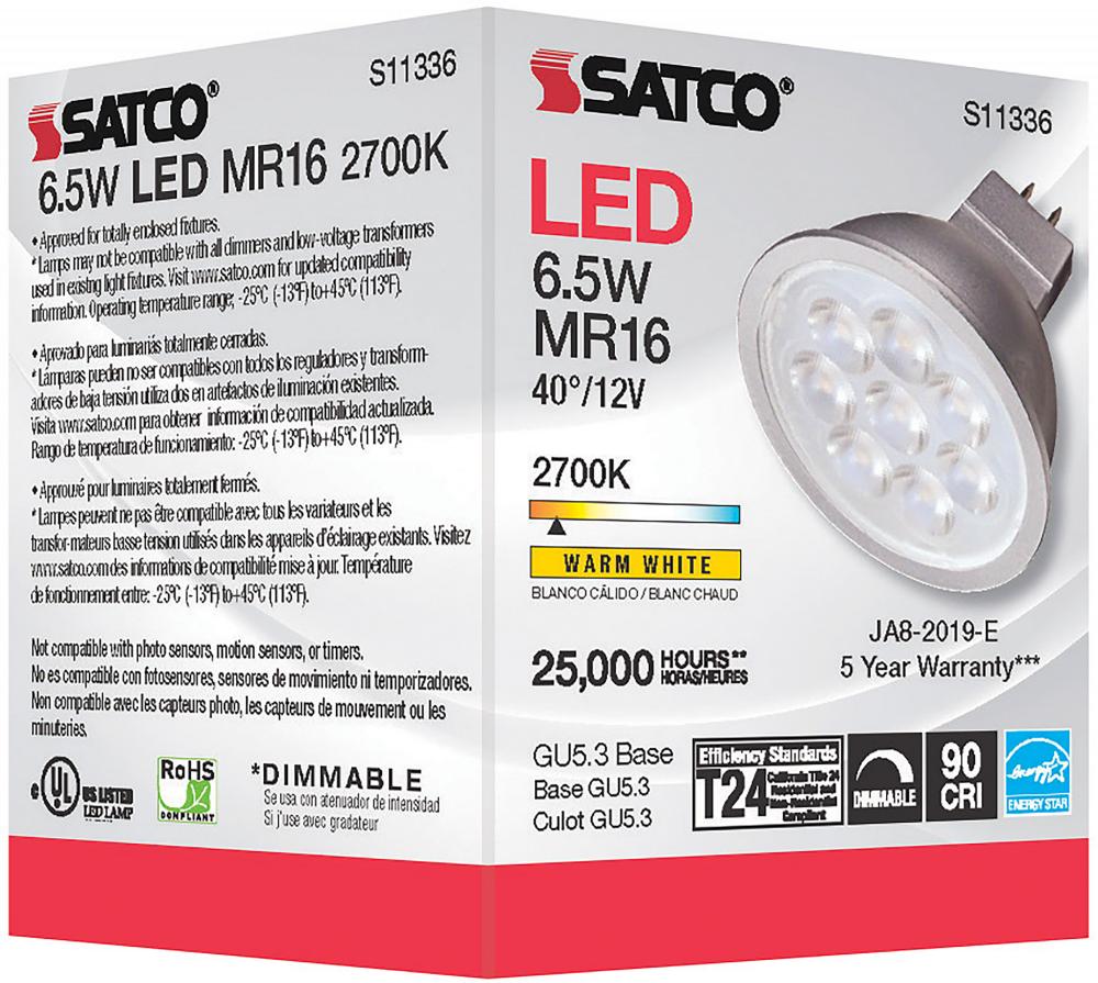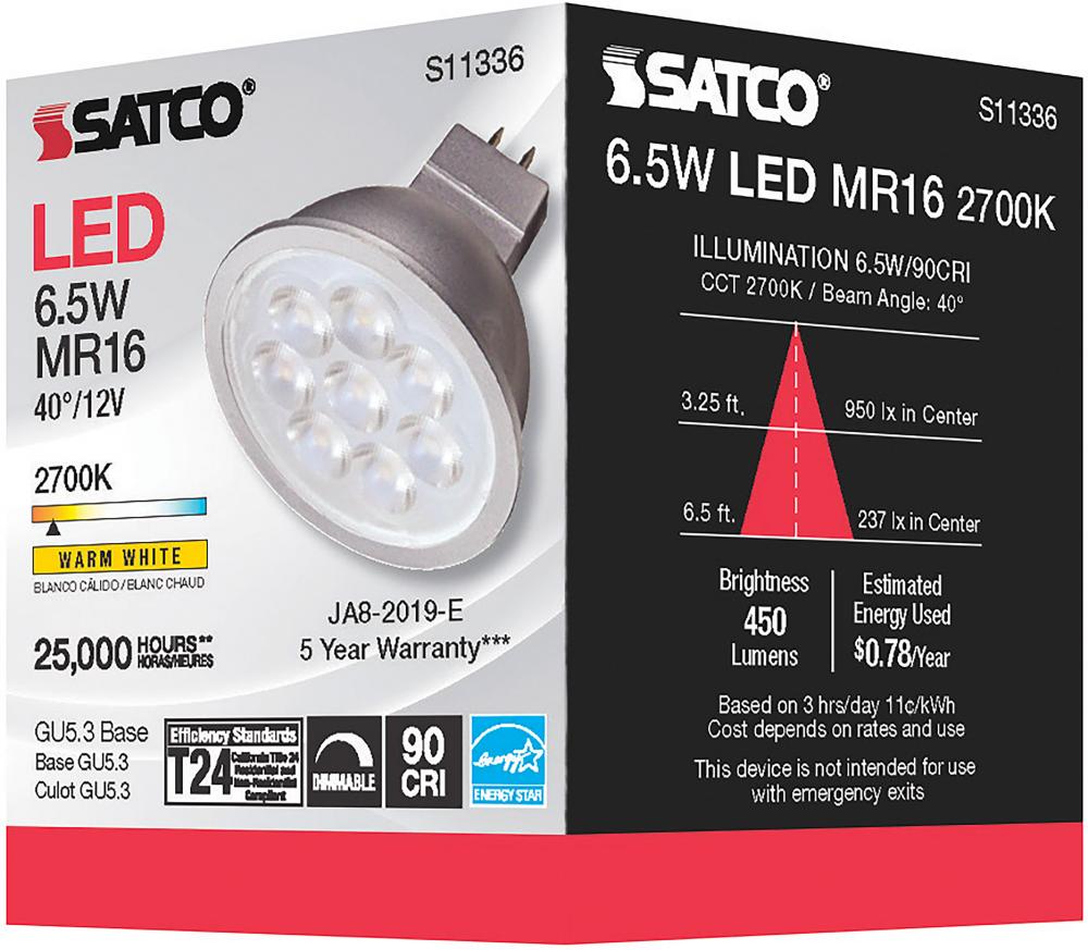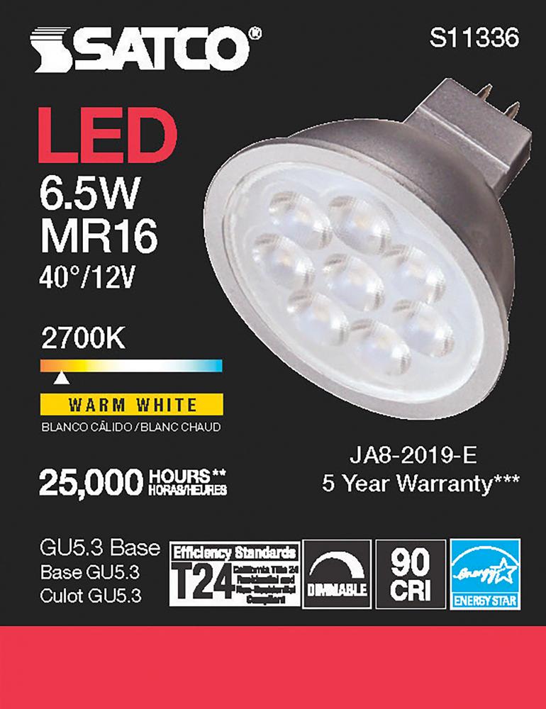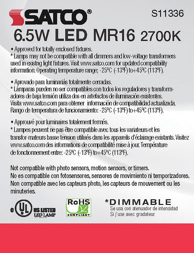 Satco's S11336 6.5-watt, forward and reverse phase dimmable LED lensed bulb offers warm white light and a 40 degree beam spread. Ideal for residential and commercial lighting applications, this LED bulb is dimmable and long-lasting. The bulb has a GU5.