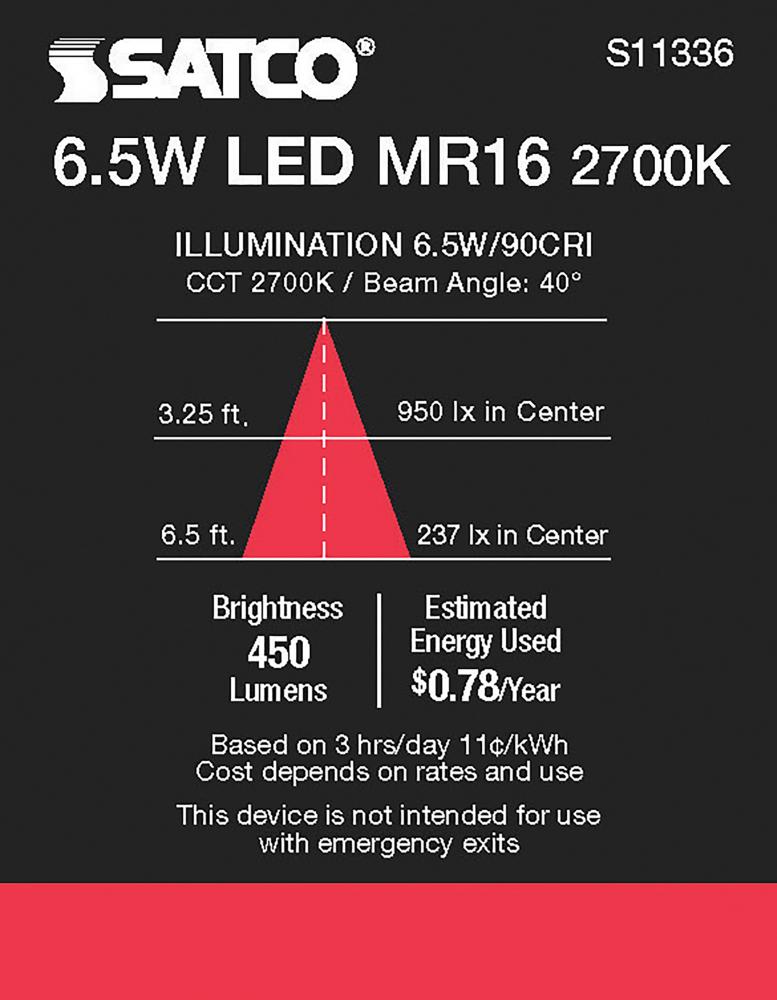 6.5 Watt; MR16 LED; 2700K; GU5.3 base; 40 deg. Beam Angle; 12 Volt