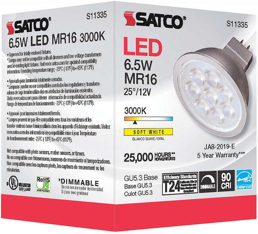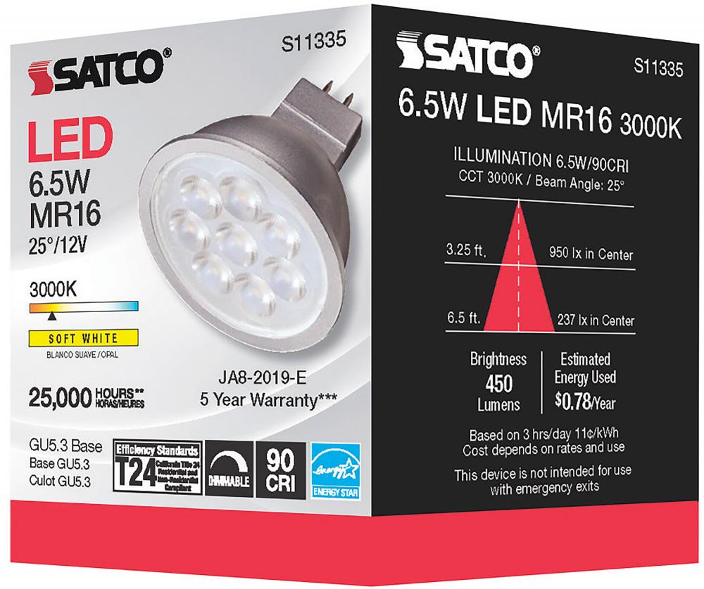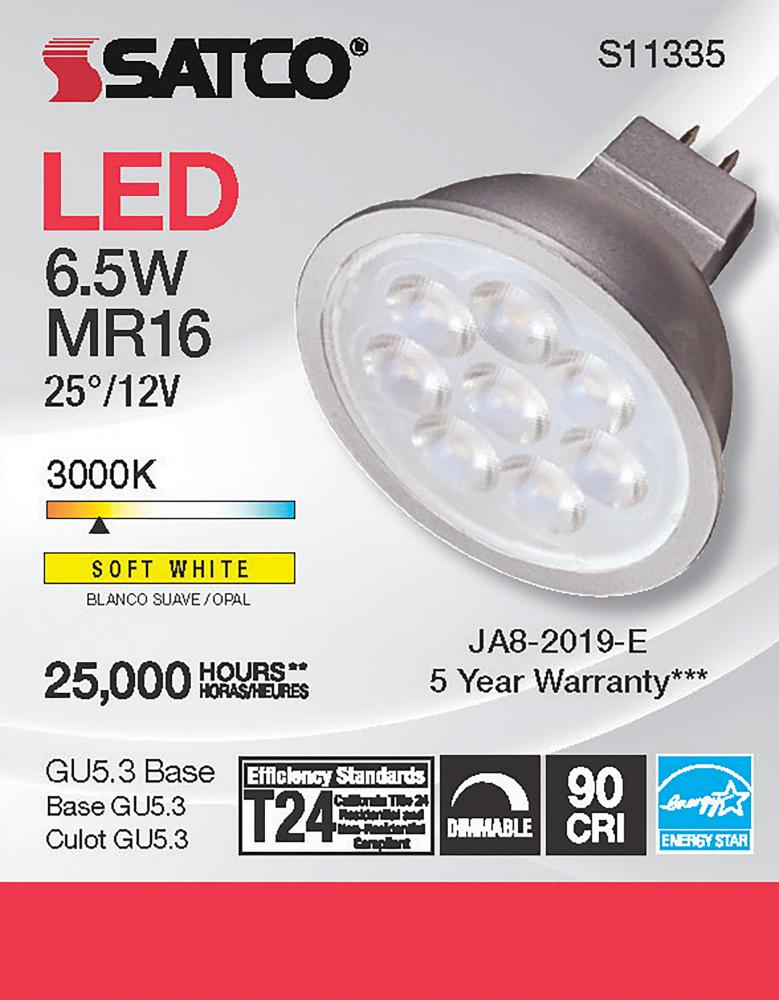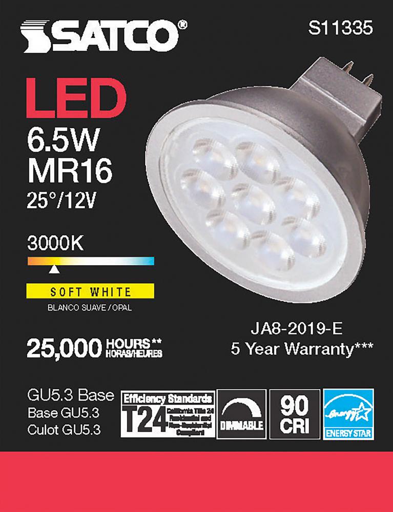 Satco's S11335 6.5-watt, forward and reverse phase dimmable LED lensed bulb offers warm white light and a 25 degree beam spread. Ideal for residential and commercial lighting applications, this LED bulb is dimmable and long-lasting. The bulb has a GU5.