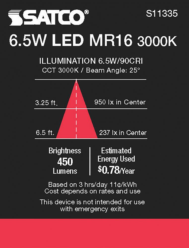 6.5 Watt; MR16 LED; 3000K; GU5.3 base; 25 deg. Beam Angle; 12 Volt