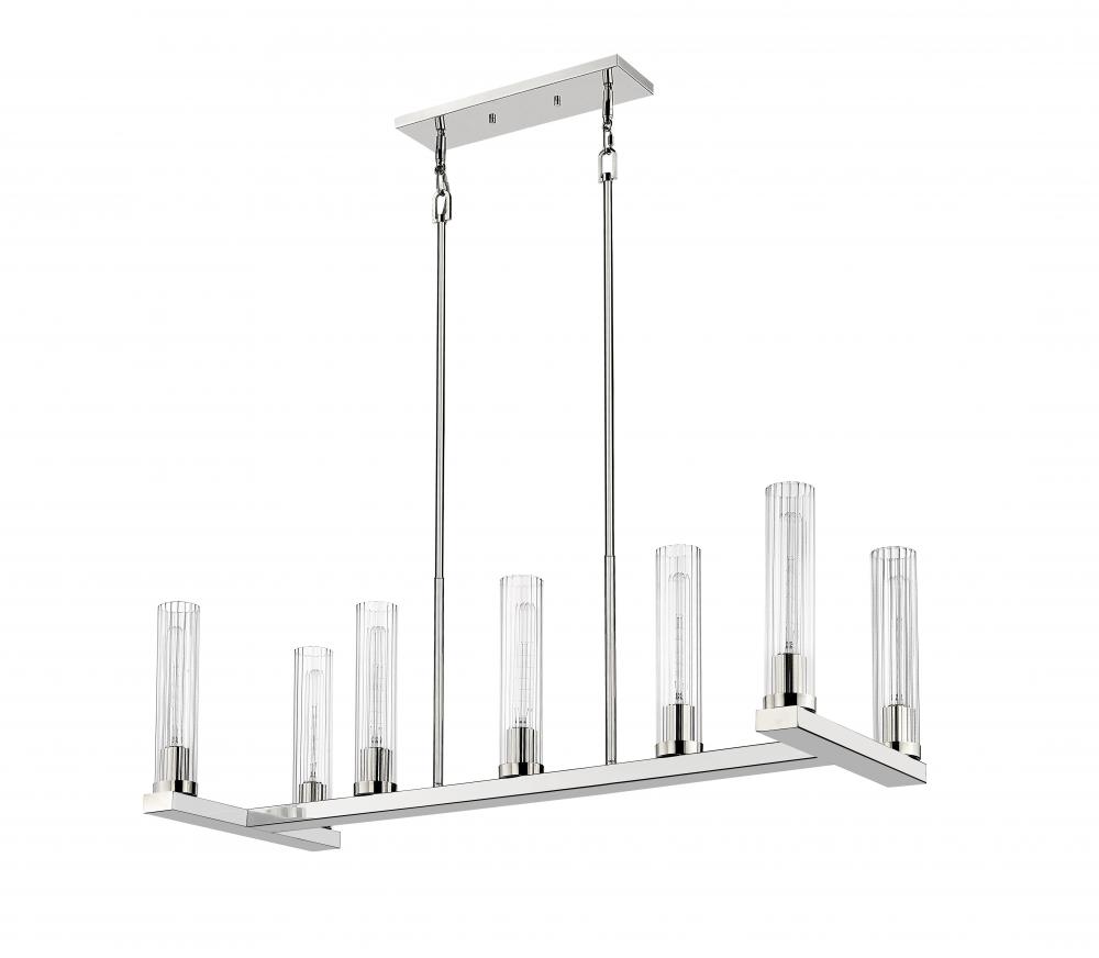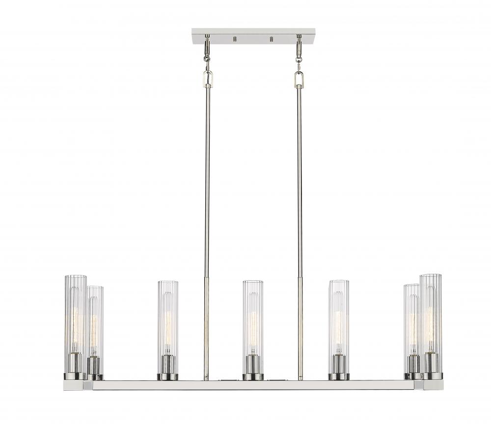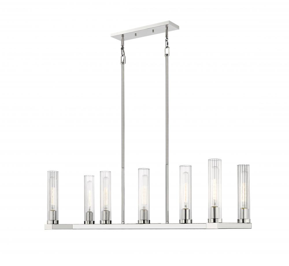 Clean geometric silhouetting flatters the Beau seven-light island/billiard light, an excellent option for adding ambient lighting in a transitional kitchen or entertaining space. This classic fixture offers a linear profile carefully arranging tall cylindrical fluted glass shades along a steel frame crafted of gleaming polished nickel finish steel. Suspension cords with industrial-inspired accenting brings a chic transitional quality to this sophisticated island/billiards light that adapts beautifully to entertaining spaces of all types.