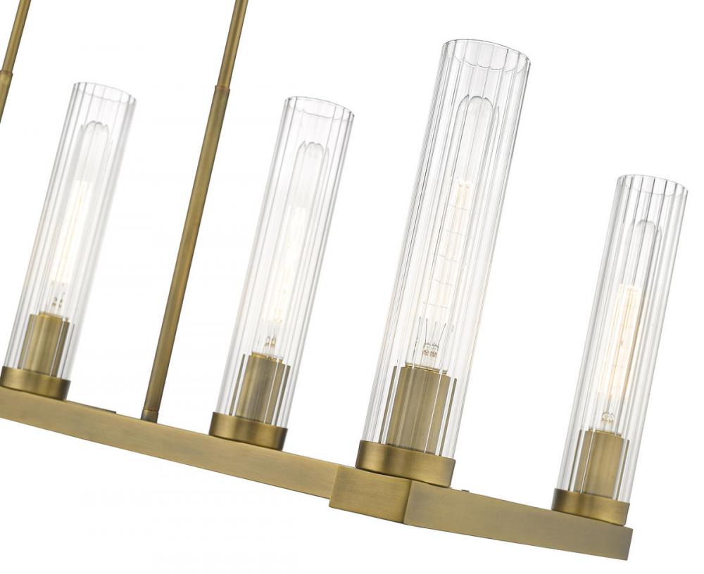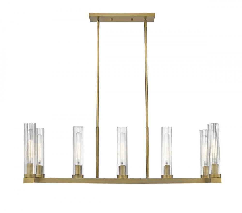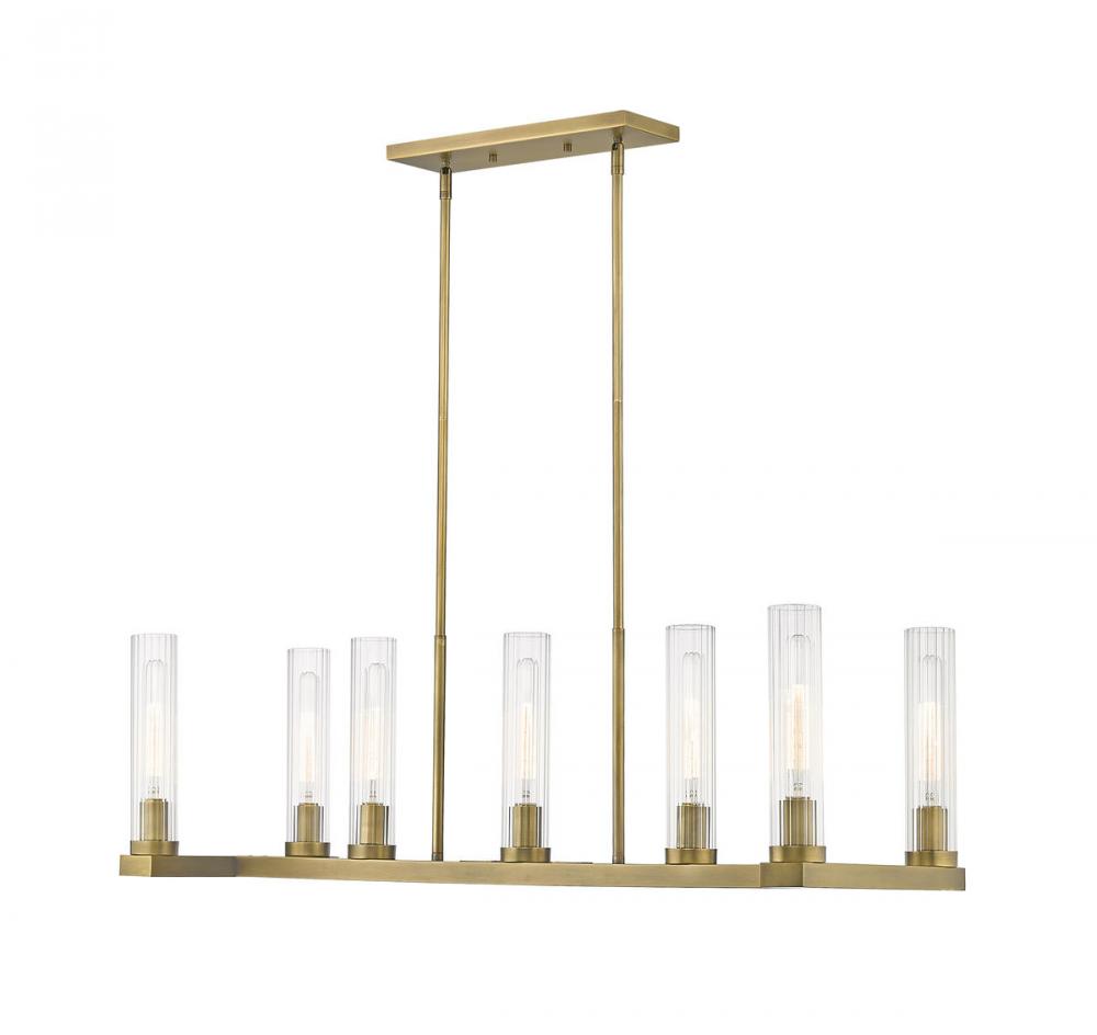 Brighten up a kitchen or rec room with effortless, modern flair. Sleek and elegant, this metal island light features seven textured glass shades for a soft, inviting glow. A rubbed brass finish adds a sophisticated flair thats ideal for transitional d?cor.