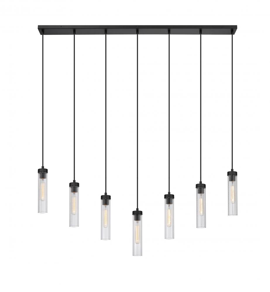 Welcome the orderly silhouetting and contrasting glam artistry of a light fixture with design power. Choose this seven-light linear chandelier to make a statement in a custom contemporary space, embracing a careful arrangement of delicate fluted glass shades that dangle at graduated lengths from a bold matte black finish metal canopy, delivering a captivating example of radiance and fluidity.