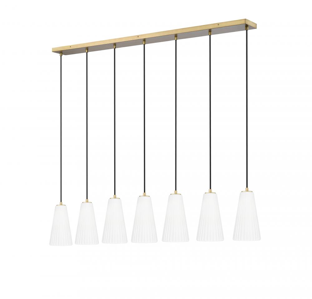 Infuse refined energy over a kitchen island or dining table with a modern seven-light linear chandelier. A striking presentation of elongated frosted glass shades with delicate fluting highlights the fixture. Its modern gold finish canopy and hardware add a hint of warm sophistication.