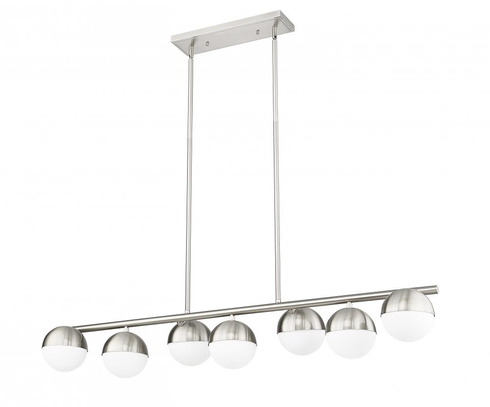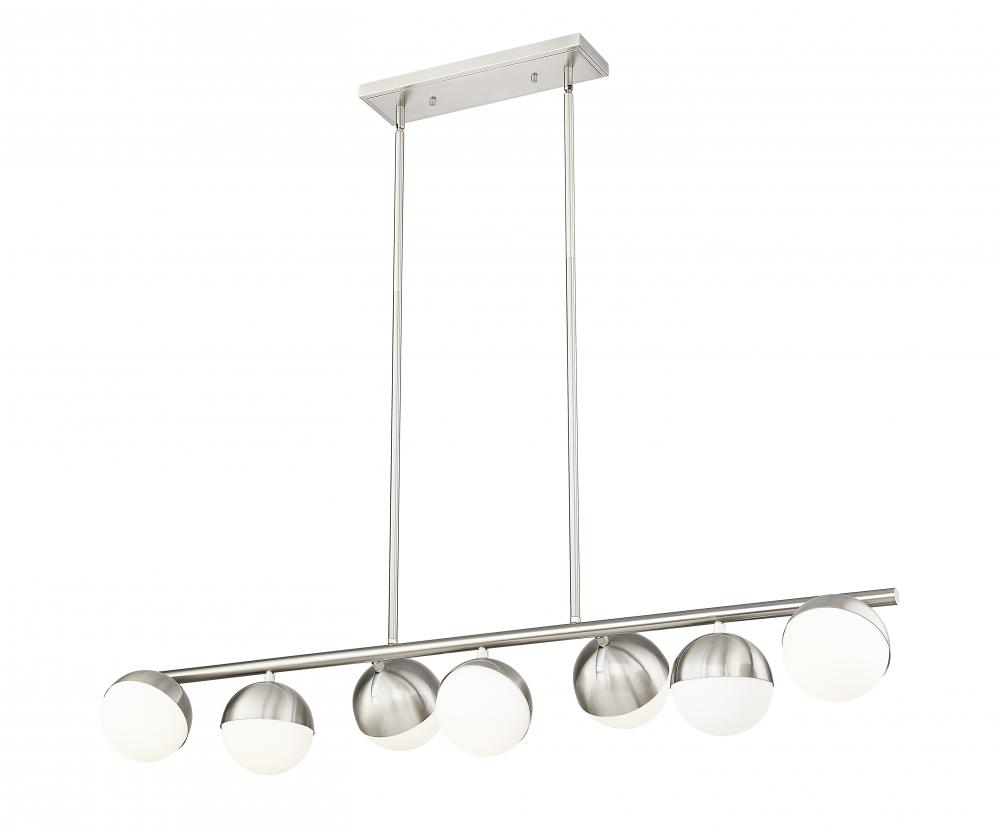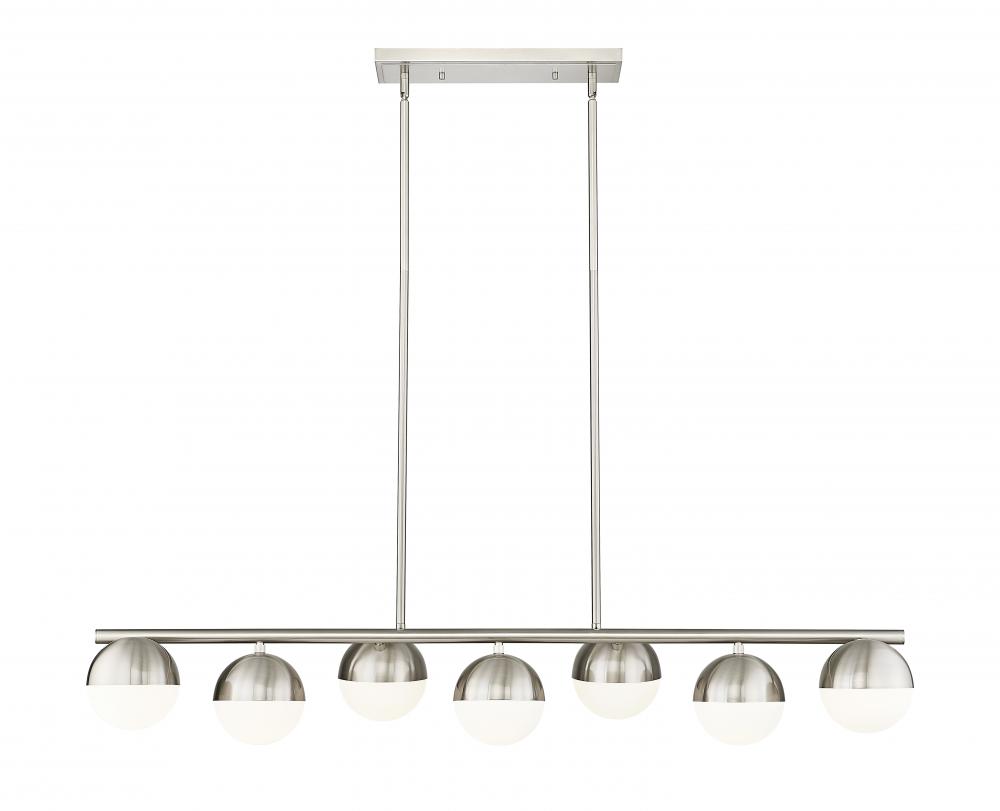 An alternating arrangement of orb lights creates a compelling silhouette for this modern seven-light linear chandelier. In brushed nickel, it offers personality and a streamlined silhouette, complete with metal shields over matte opal glass shades. Its the perfect choice for a large kitchen island or dining table.