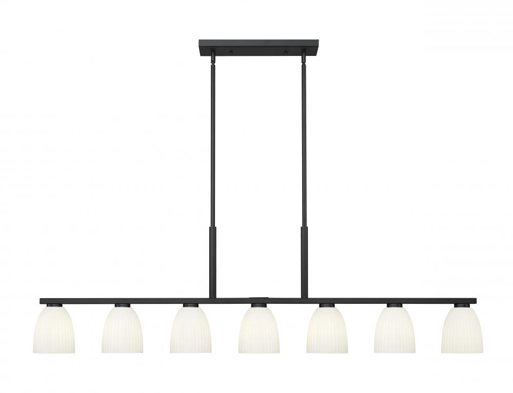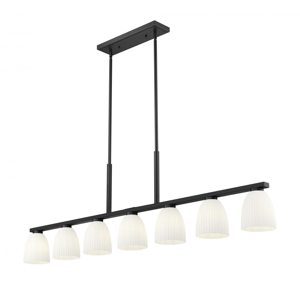 A matte black finish brings bold simplicity to this seven-light linear chandelier, offering high contrast and low drama. The ribbed matte opal glass shades cast a soft, ambient glow that floats evenly across long surfaces. Perfectly proportioned for dining tables or kitchen islands, it?s a piece that shapes the space around it.