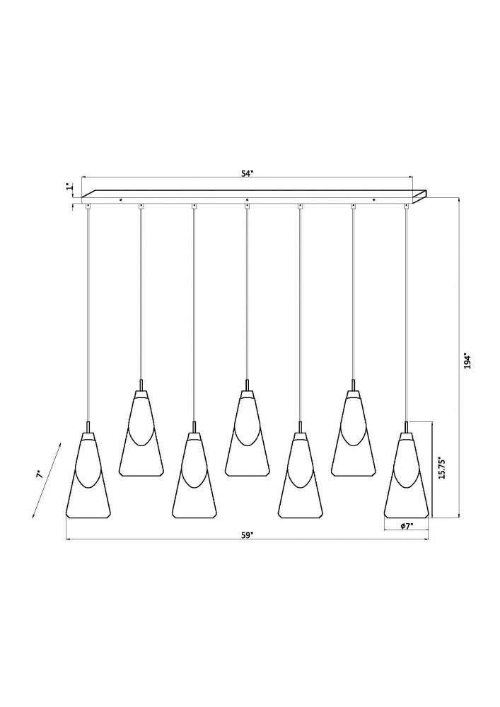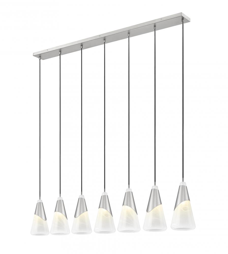 A single row of seven lights creates a linear silhouette for this modern chandelier. Perfect for a kitchen island, it enchants with icy swirled artisan glass wrapped in metal shrouds, capturing a sense of fluidity that enhances any space. A brushed nickel finish gleams softly in the light and offers timeless character.