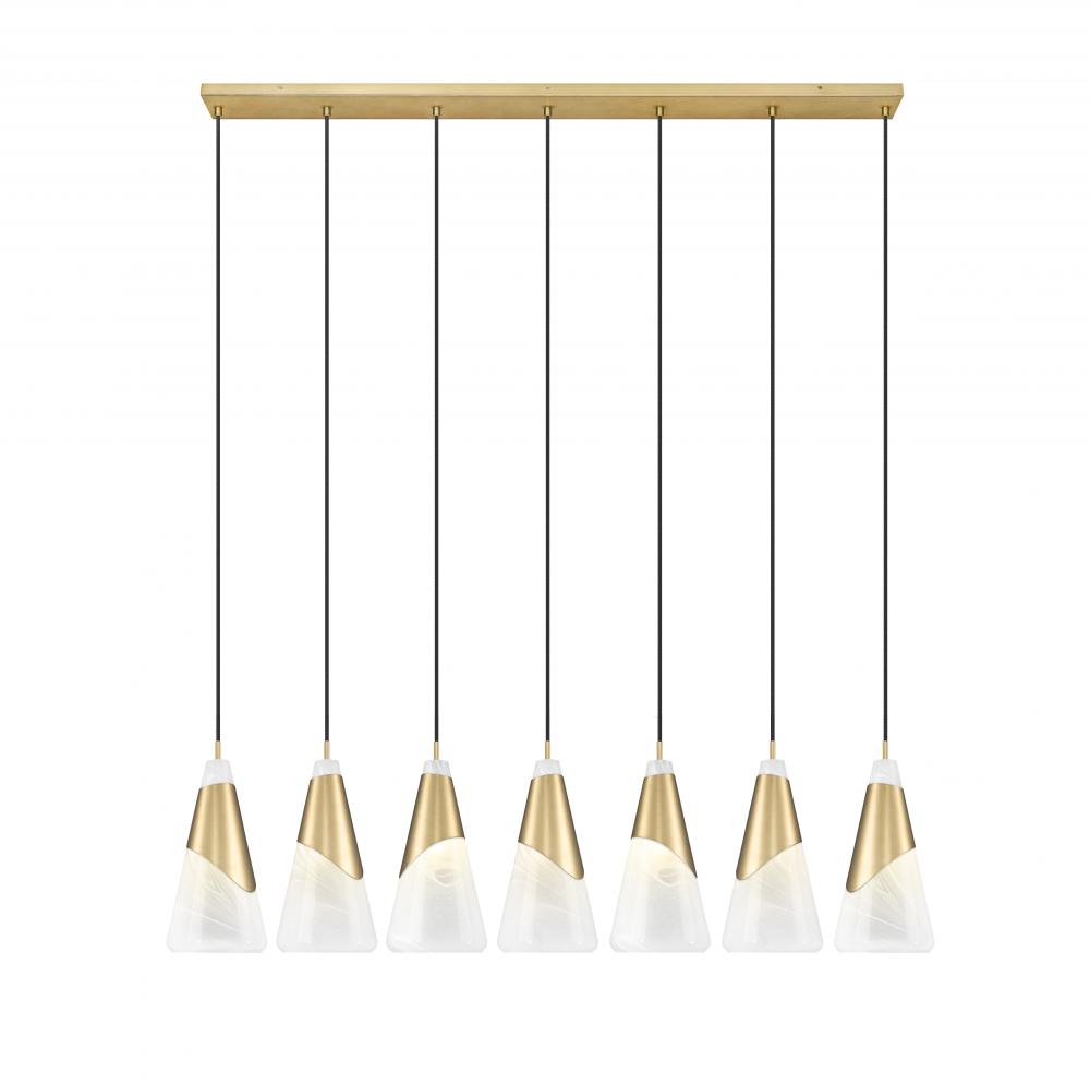 Inspired style blends with inviting warmth in a modern seven-light linear chandelier. In a modern gold finish, it captures timeless allure and attention with curvy metal shrouds and icy swirled artisan glass shades. The conical shades suspend in a single line from an elongated canopy, creating chic style over a kitchen island or dining table.
