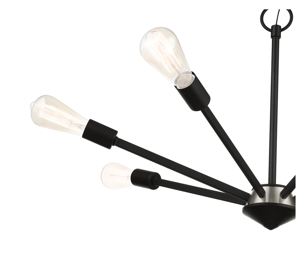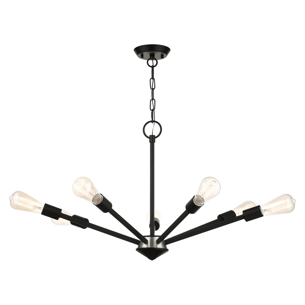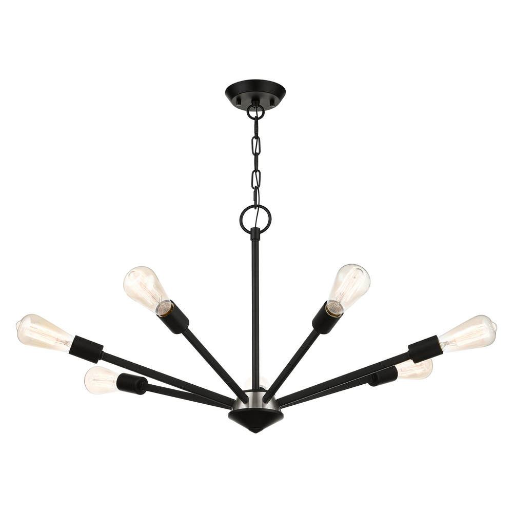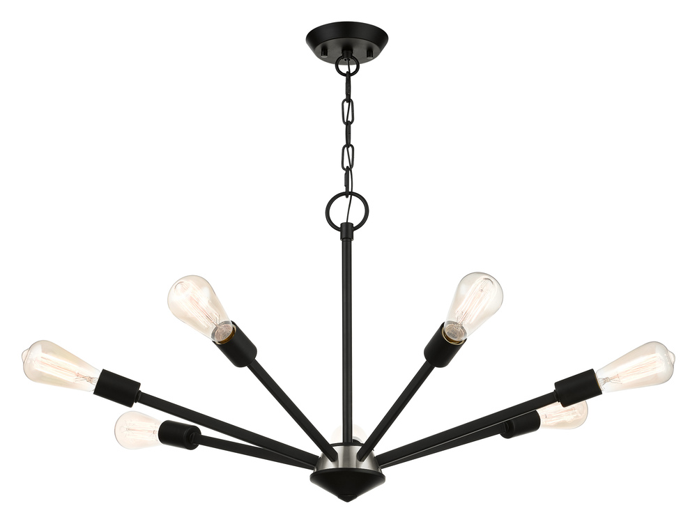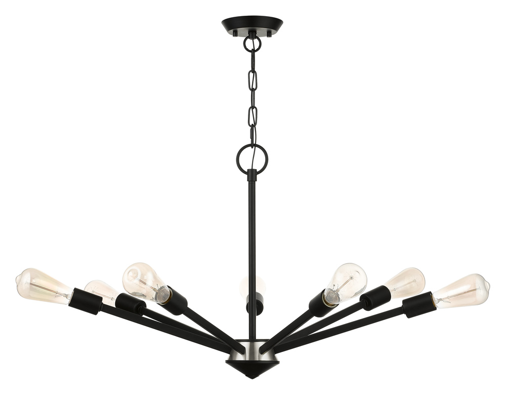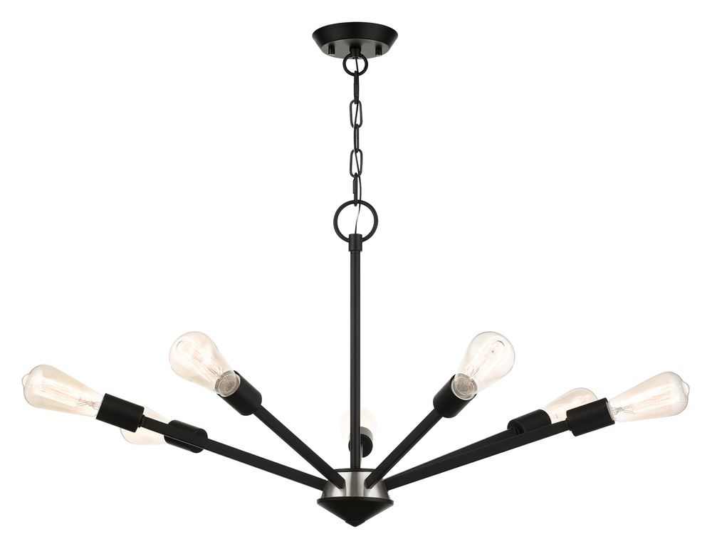 Add eye-catching lighting to your home decorating with the lively look of the Prague chandelier in black finish with a brushed nickel finish accent. This seven-light design features vintage style Edison bulbs that up the style factor, giving it an attractive, mid-century modern and industrial edge.