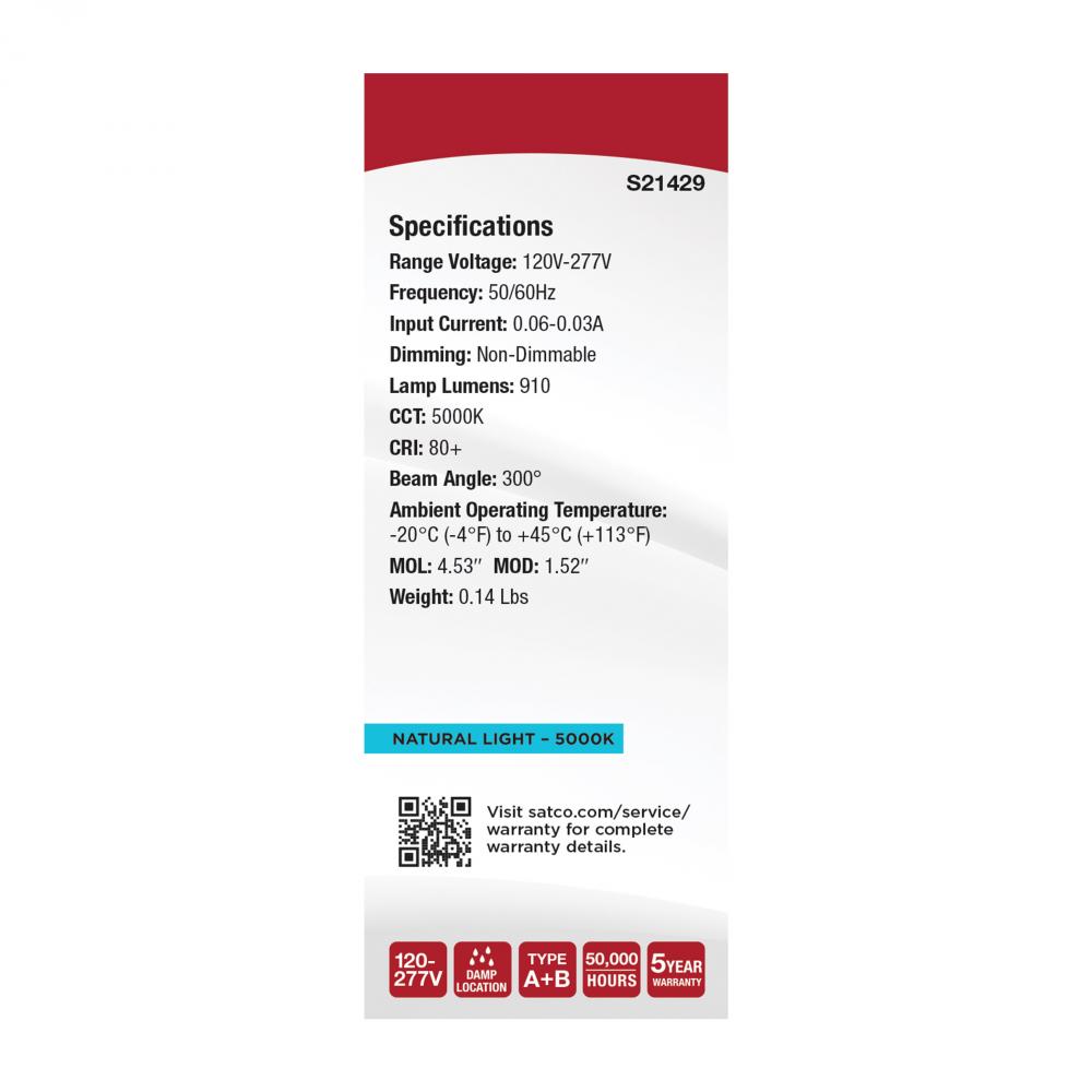 7 Watt; PL LED; G24D Base; Frost Finish; Type A/B Dual Ballast; 5000K; 120-277 Range Voltage