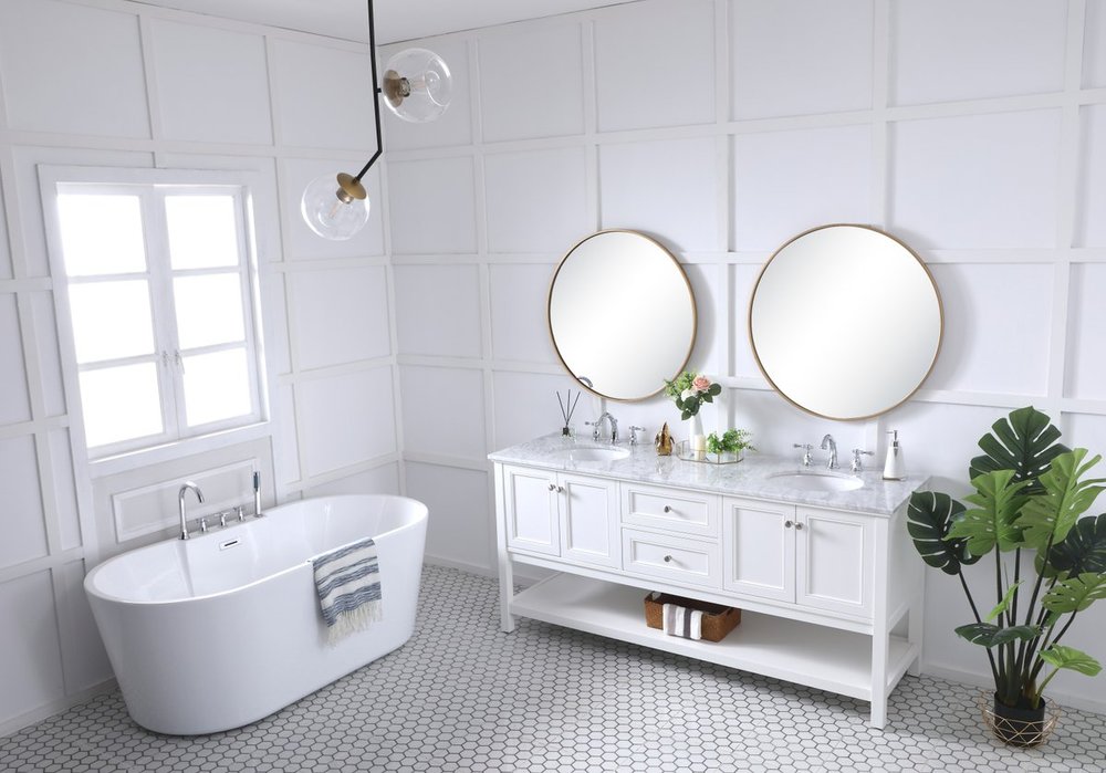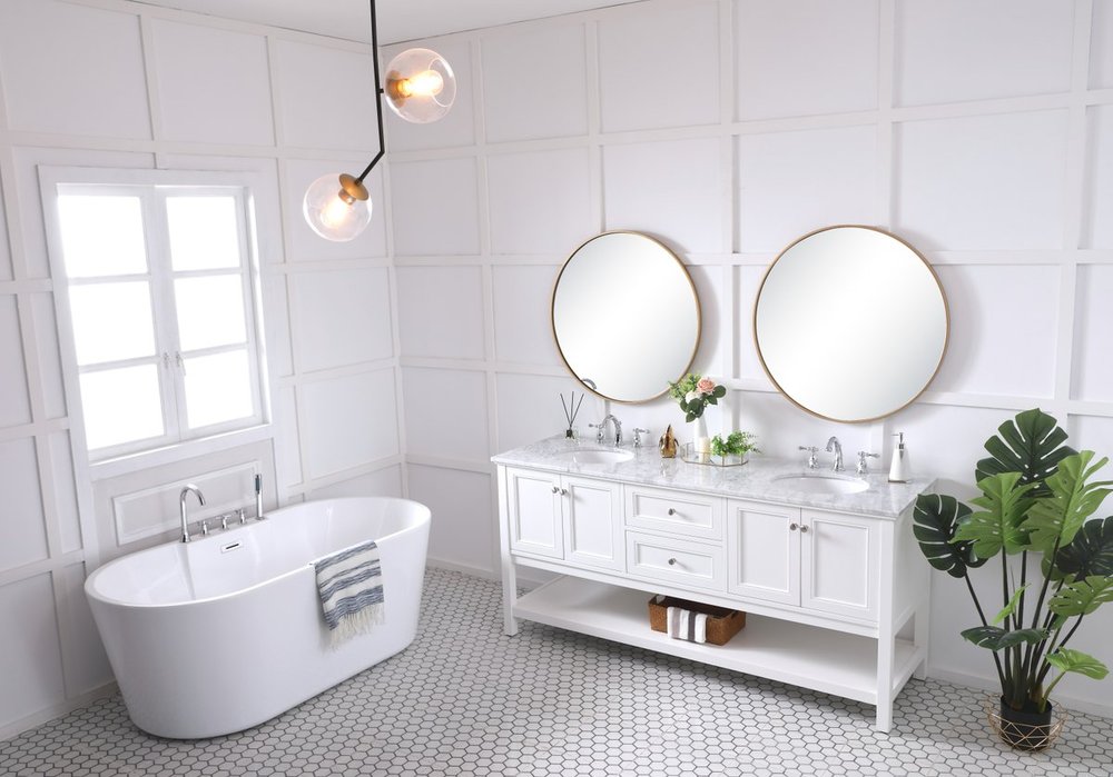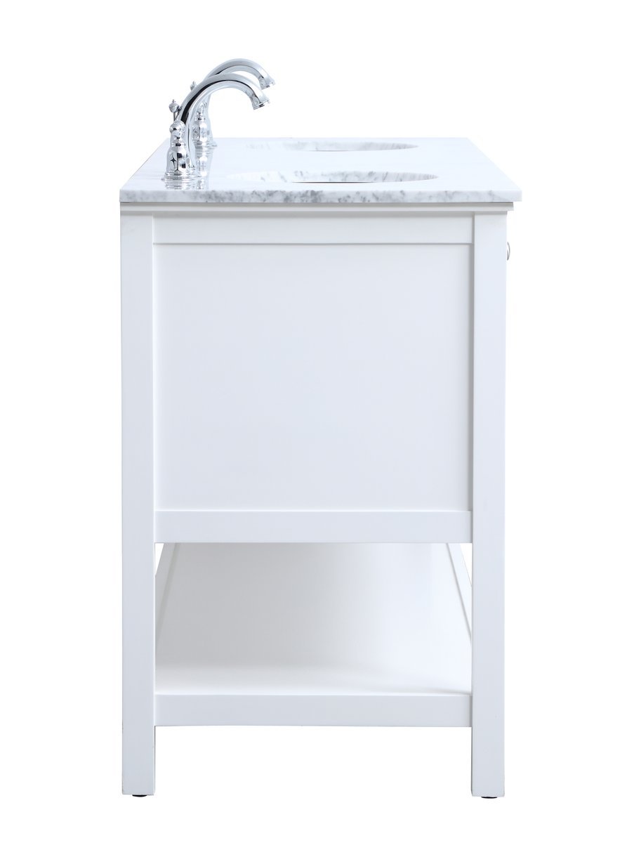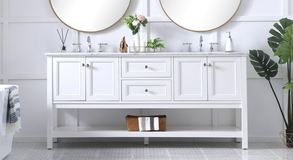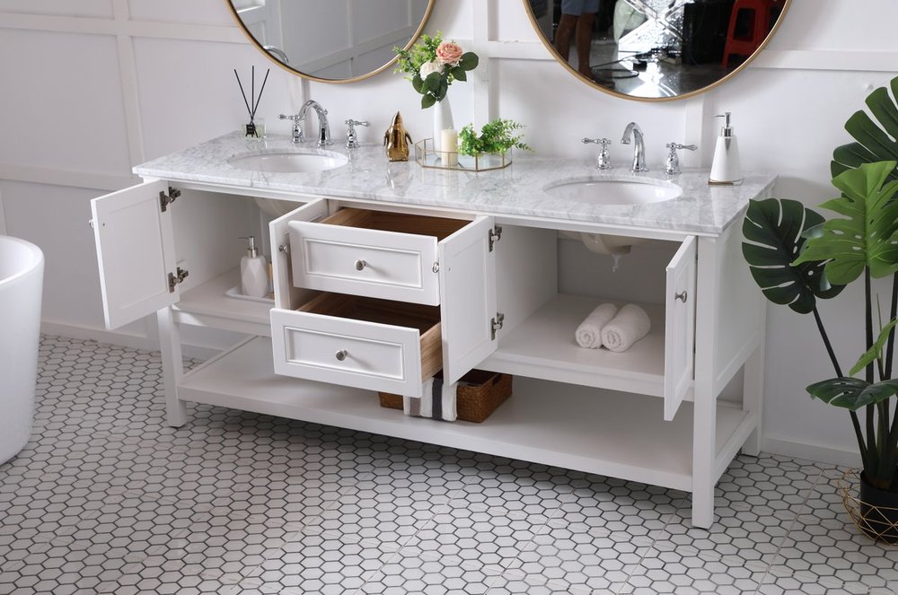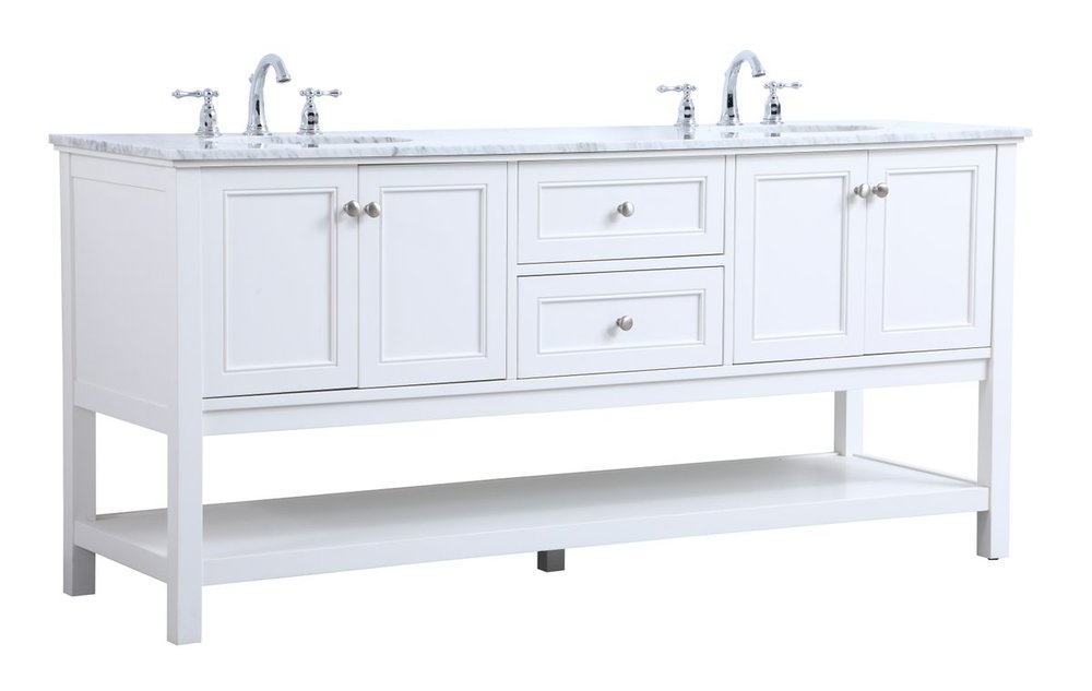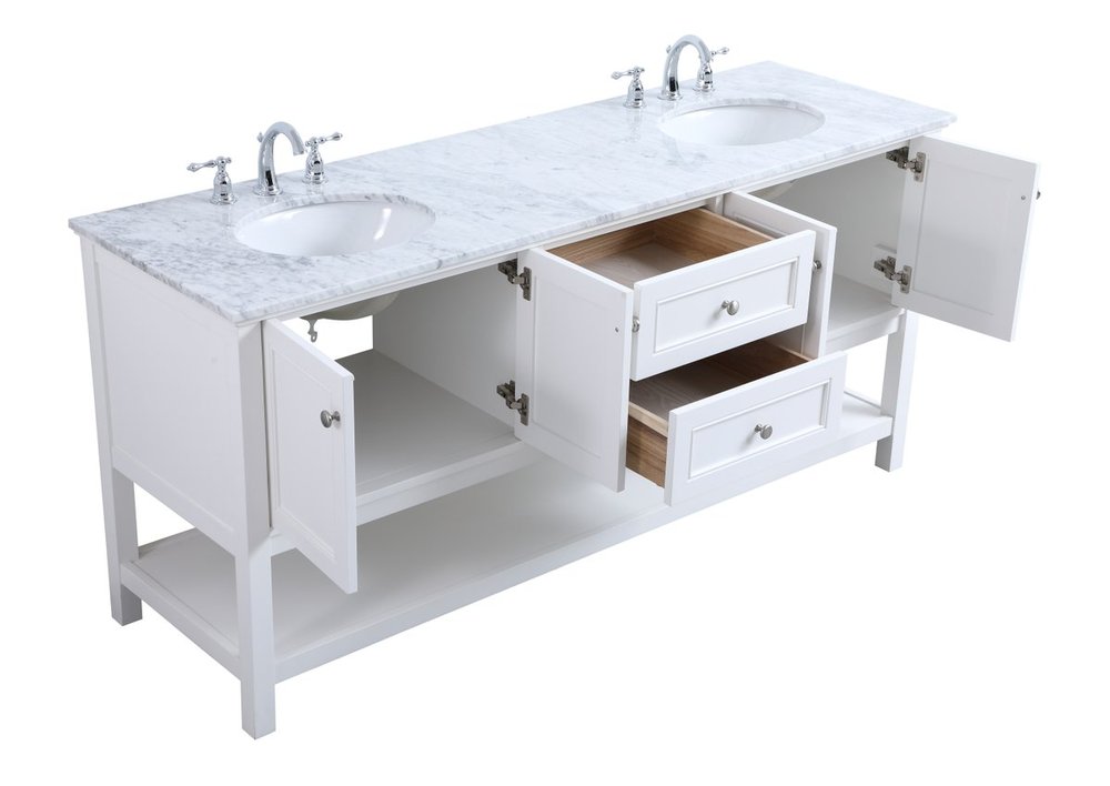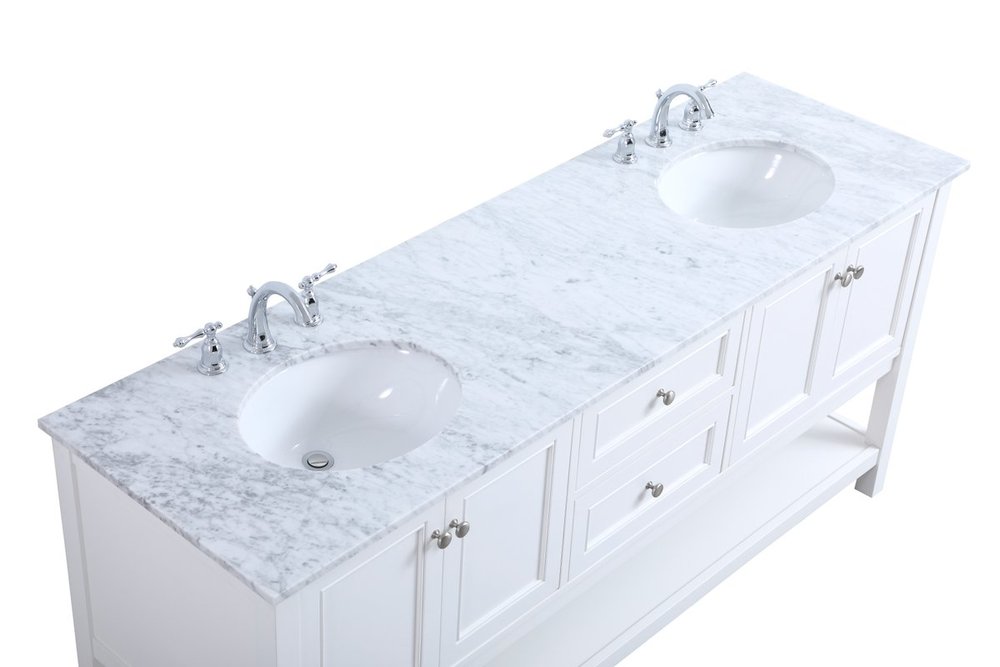 Create a refined and relaxing bath space with this contemporary design vanity, presenting its simplicity and clean straight lines in a minimalist appeal. This 72" freestanding vanity, crafted of solid poplar wood in white finish, provides ample storage within its double center drawers and 4 side doors, all equipped with soft closing mechanism and accentuated with gleaming chrome hardware. Rounding out the design is a luxurious Itallian Carrara white marble countertop and double white porcelain under-mount oval sink.