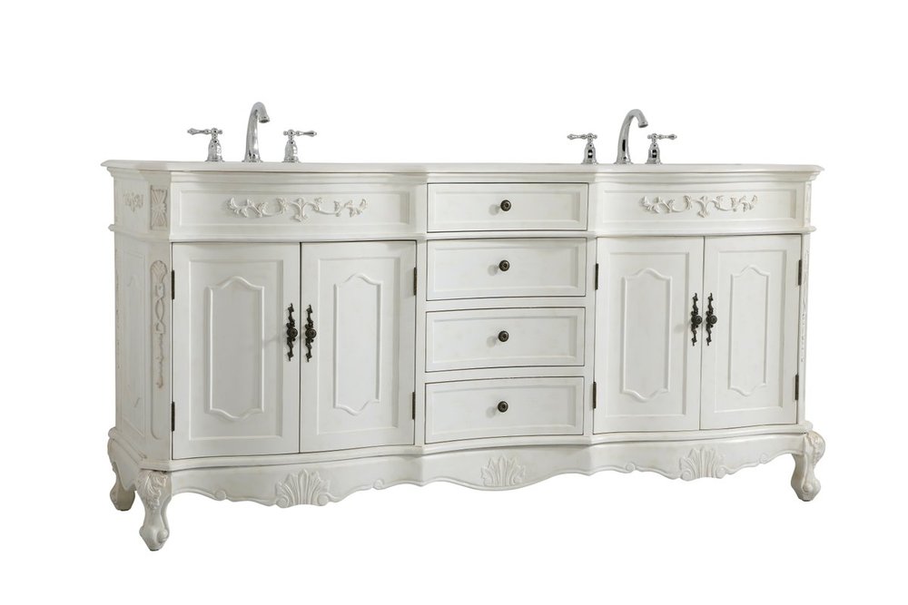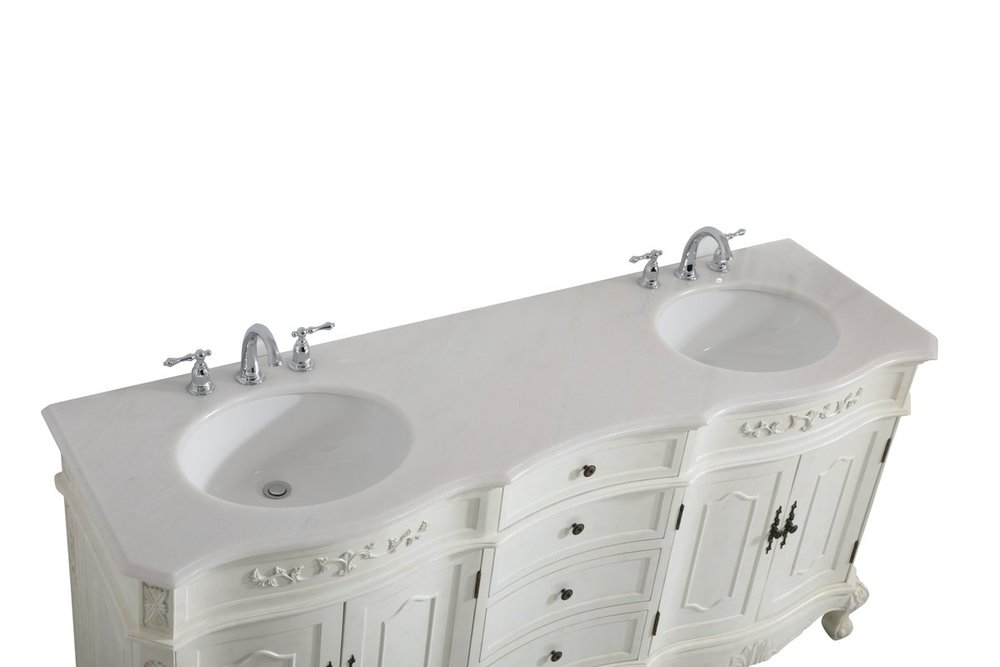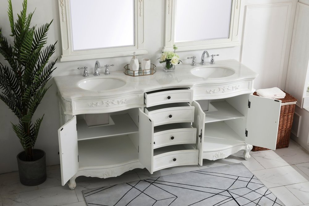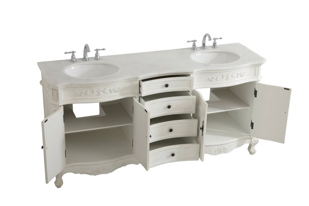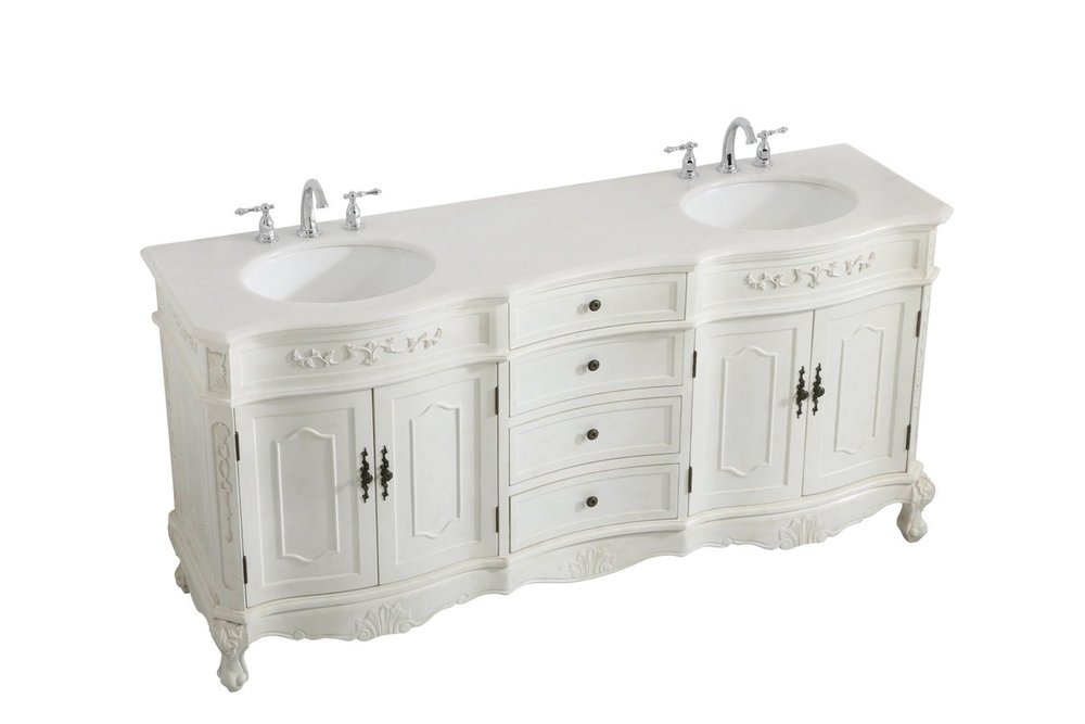 The Danville collection 72" vanity in an antique white finish and double sink brings about traditional beauty. Decorated with ornate filigrees and engravings throughout, your bathroom or powder room will exude refined beauty. Don't let the design fool you, the antique bronze hardware allows you to discover storage spaces with ease. The simple knobs allows you to glide the 4 center drawers out, while the ornate knobs help you open the four cabinet doors. With two porcelain undermount sinks and ample white marble with occasional subtle coffee color veins countertop space, two people can get ready with ease and comfort. You and your guests will marvel at this vanity that will both store away your bathroom essentials and enhance the aesthetics of your room.