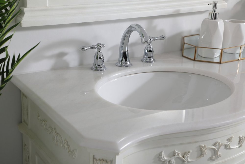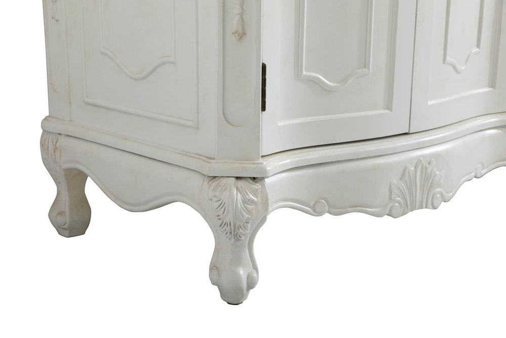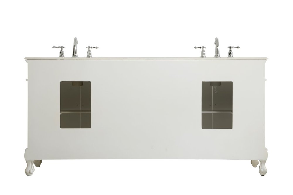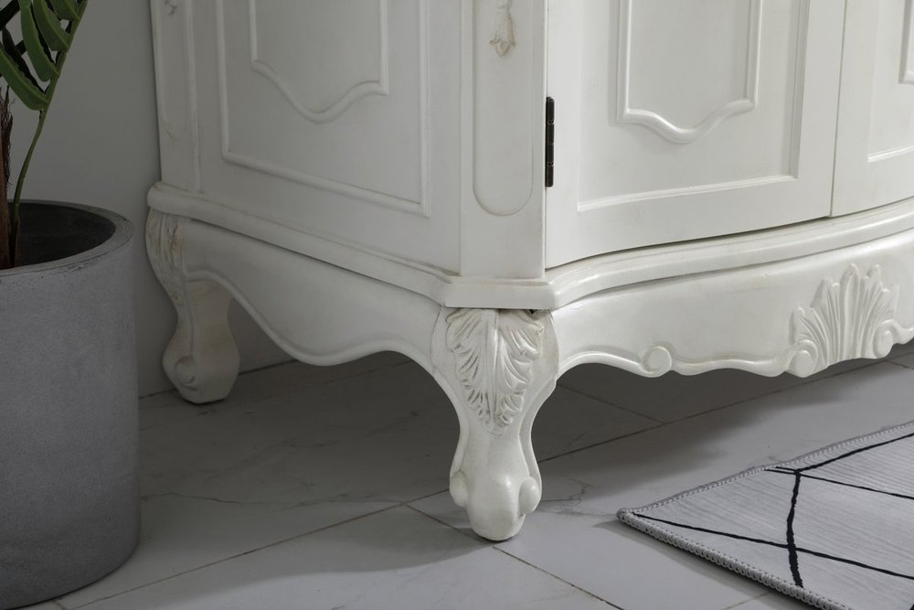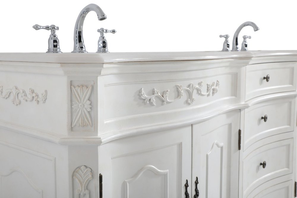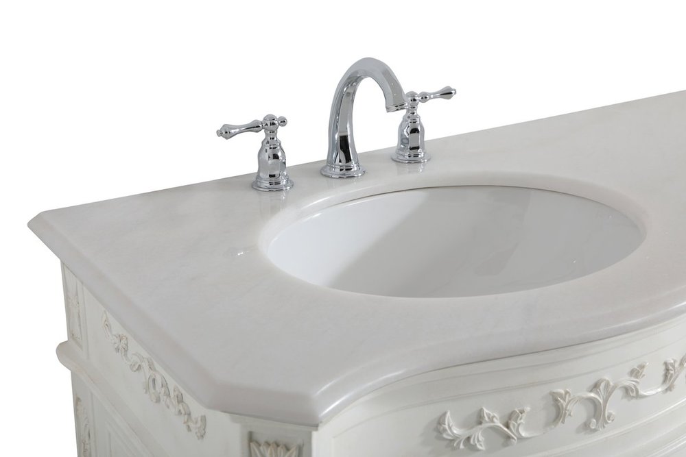 The Danville collection 72" vanity in an antique white finish and double sink brings about traditional beauty. Decorated with ornate filigrees and engravings throughout, your bathroom or powder room will exude refined beauty. Don't let the design fool you, the antique bronze hardware allows you to discover storage spaces with ease. The simple knobs allows you to glide the 4 center drawers out, while the ornate knobs help you open the four cabinet doors. With two porcelain undermount sinks and ample white marble with occasional subtle coffee color veins countertop space, two people can get ready with ease and comfort. You and your guests will marvel at this vanity that will both store away your bathroom essentials and enhance the aesthetics of your room.