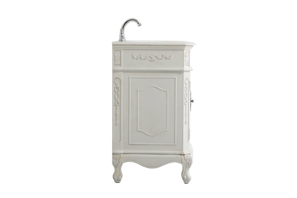 Distressed antique white finish with a luxurious white with occasional coffee color vein marble countertop