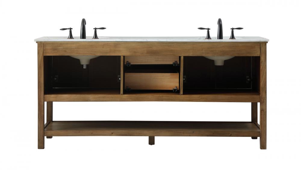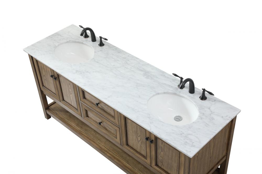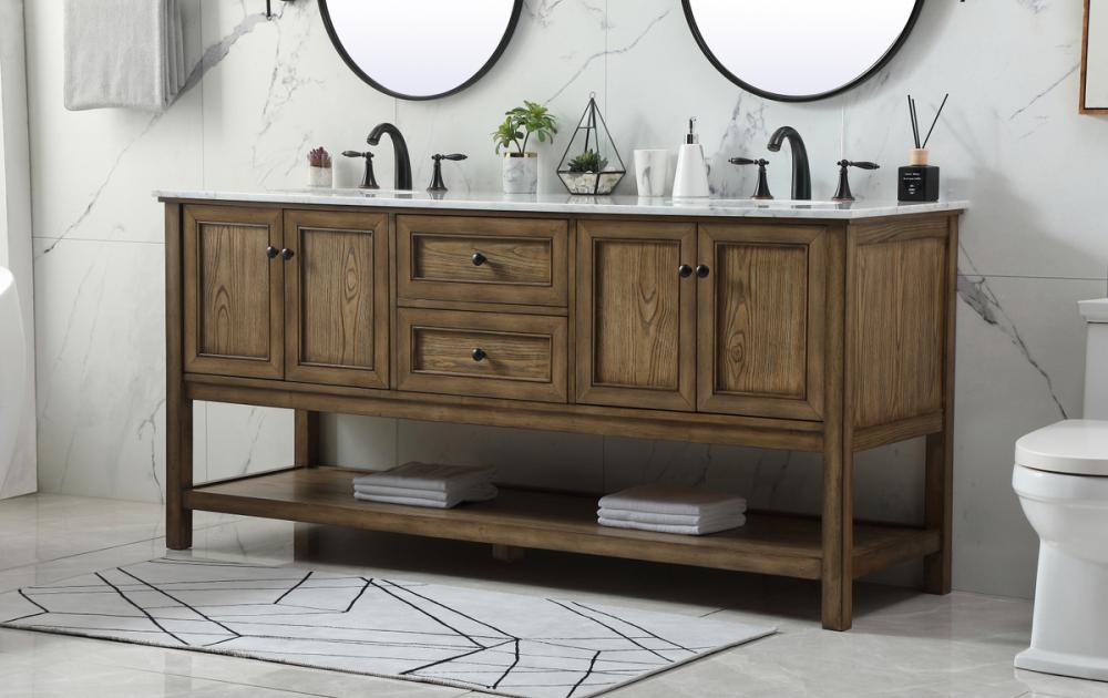 Comes with a double undermount porcelain sink and a carrara white marble countertop