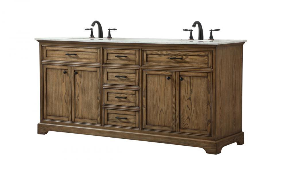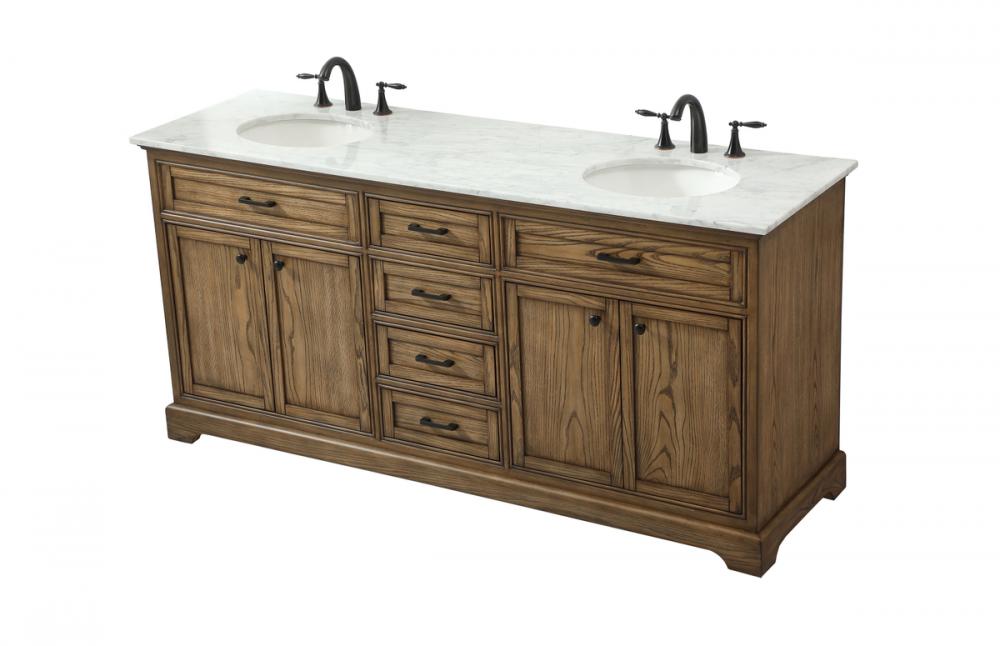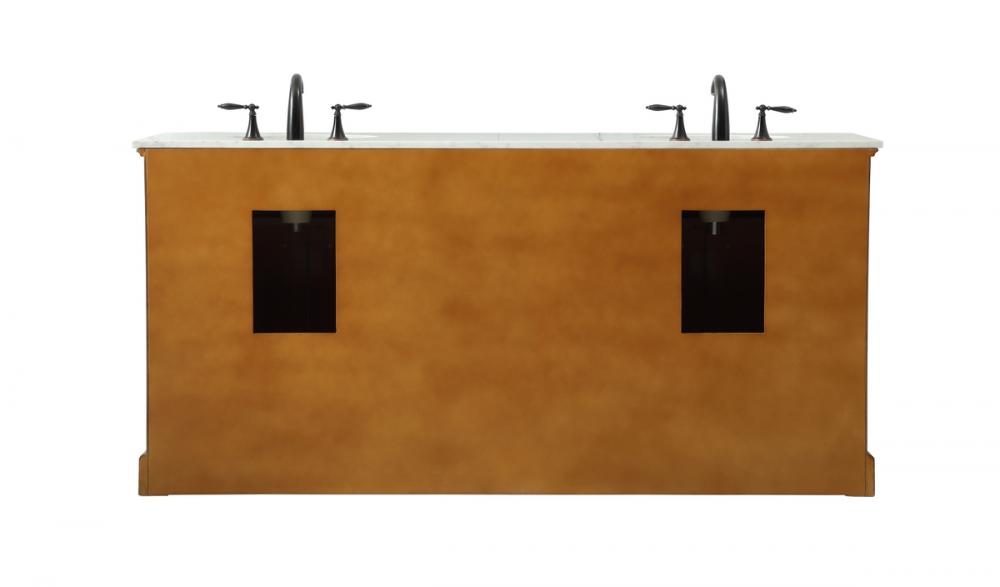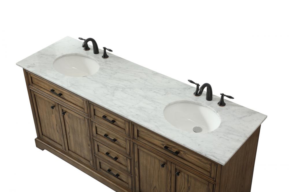 Comes with two undermount porcelain sinks and a carrara white marble countertop