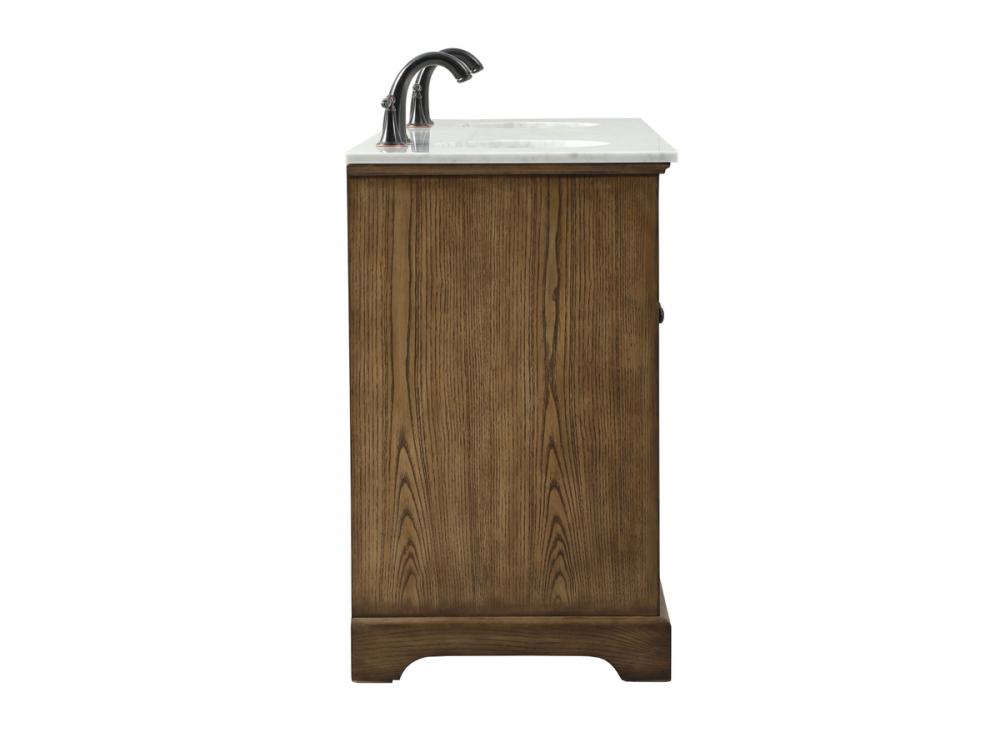 Clean lines and classic form can truly add a fresh look to your bathroom or powder room. This vanity, complemented by round hardware, will surely charm you with its confident style and subtle charisma. This vanity can store all of your bathroom toiletries, from extra towels to make up essentials. The vanity is crowned with carrara white marble and includes a porcelain undermount sink--adding both function and form that will truly amaze.