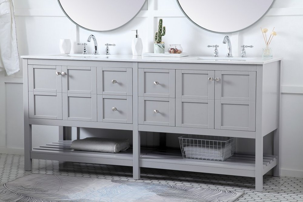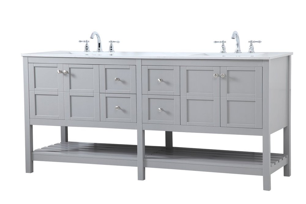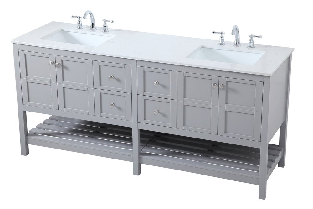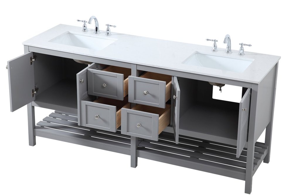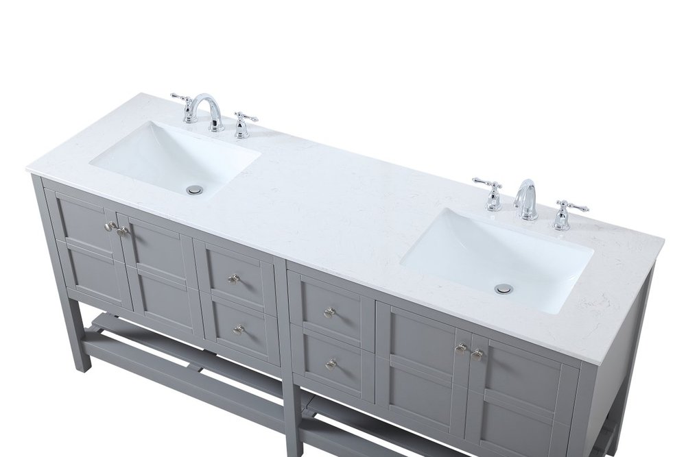 The subtle beauty of the Theo collection 72" vanity in a gray finish exudes comfortable luxury. Its modern, yet traditional beauty will surely dress up your bathroom or powder room without any fuss. The white stone countertop and porcelain undermount sink shows quiet opulence, and the legs support upright without fail. Brushed Nickel hardware complements the trendy gray finish, with pulls adorning the four cabinet doors and four drawers, showcasing ample storage space within. Slated shelf allows for additional space to organize your towels. Whether this vanity is in your bathroom or for guests, its presence will surely elevate the aesthetics of your room.