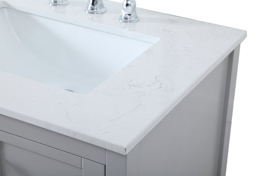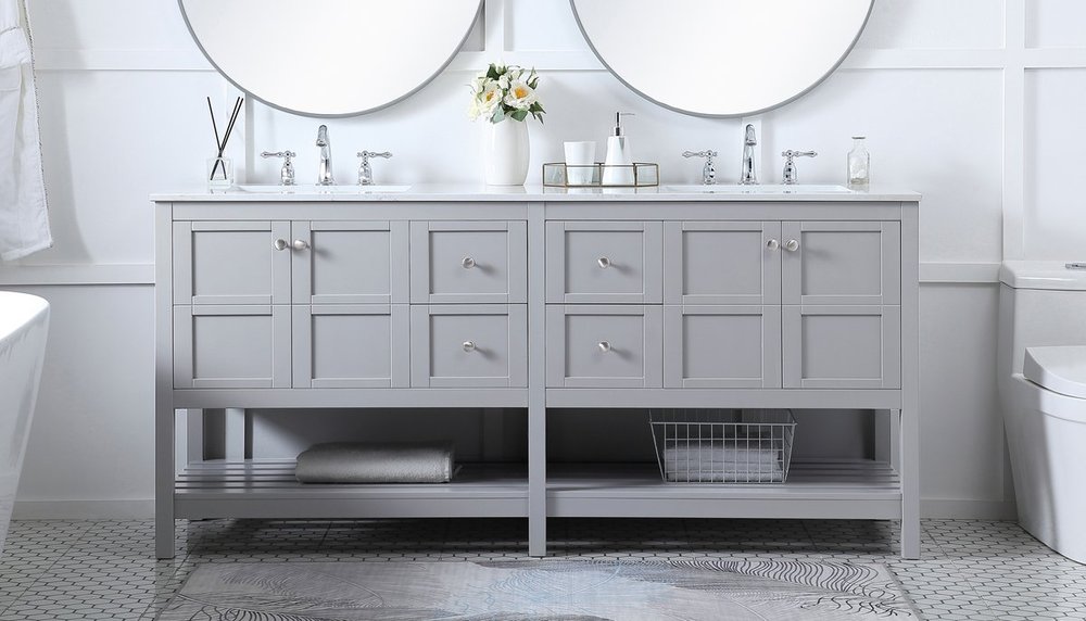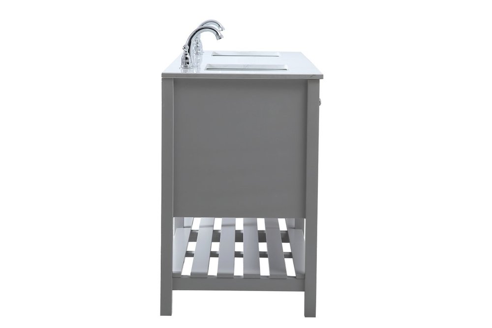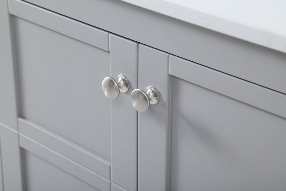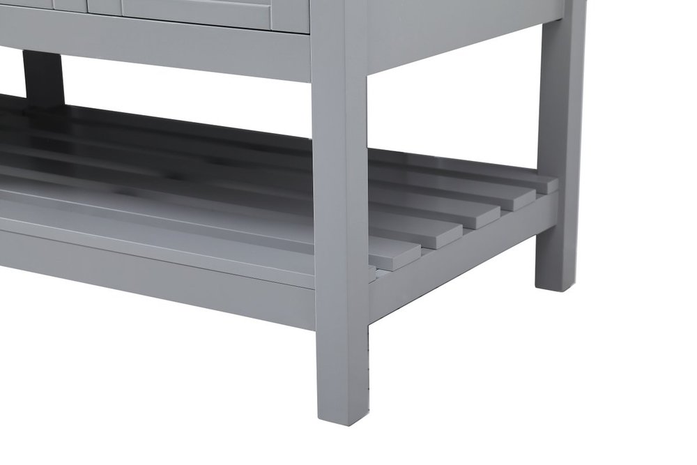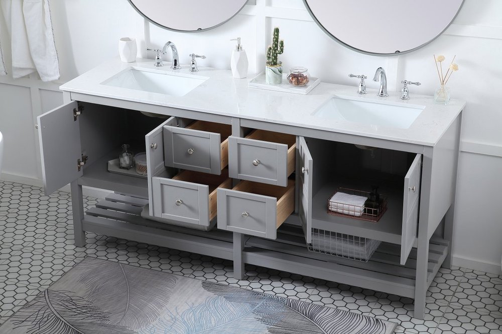 The subtle beauty of the Theo collection 72" vanity in a gray finish exudes comfortable luxury. Its modern, yet traditional beauty will surely dress up your bathroom or powder room without any fuss. The white stone countertop and porcelain undermount sink shows quiet opulence, and the legs support upright without fail. Brushed Nickel hardware complements the trendy gray finish, with pulls adorning the four cabinet doors and four drawers, showcasing ample storage space within. Slated shelf allows for additional space to organize your towels. Whether this vanity is in your bathroom or for guests, its presence will surely elevate the aesthetics of your room.
