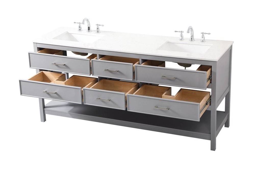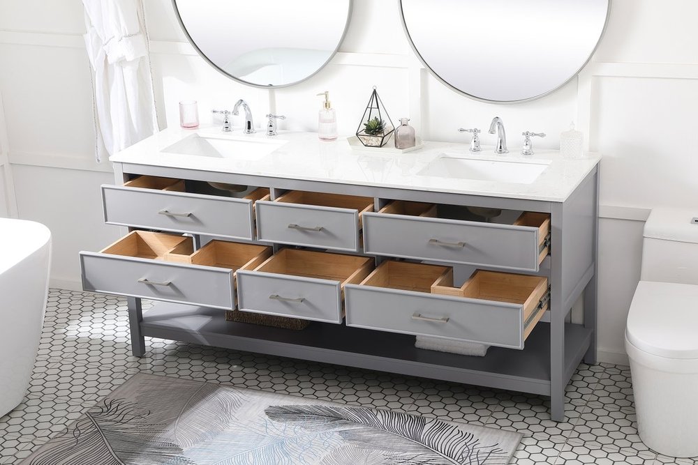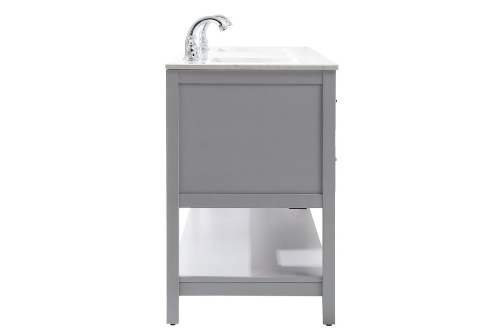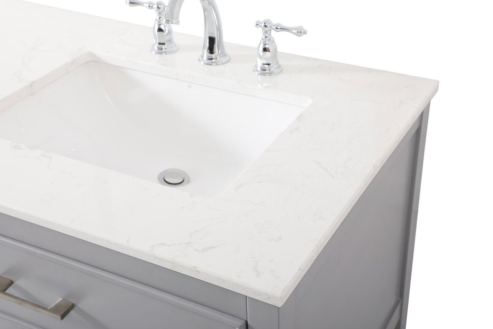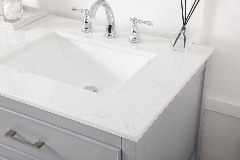 Make the most of your space with this traditional style bathroom vanity. Complements well with many aesthetics with its beautiful finish, calacatta engineered marble countertop, and the contemporary slender handle bar that sits on six functional drawers with soft closing mechanism, allowing you to store an assortment of bathroom essentials. The lower shelf makes it the perfect space to hold new towels for your guests. This compact vanity ensures both form and function in your bathroom or powder room for you and your guests.