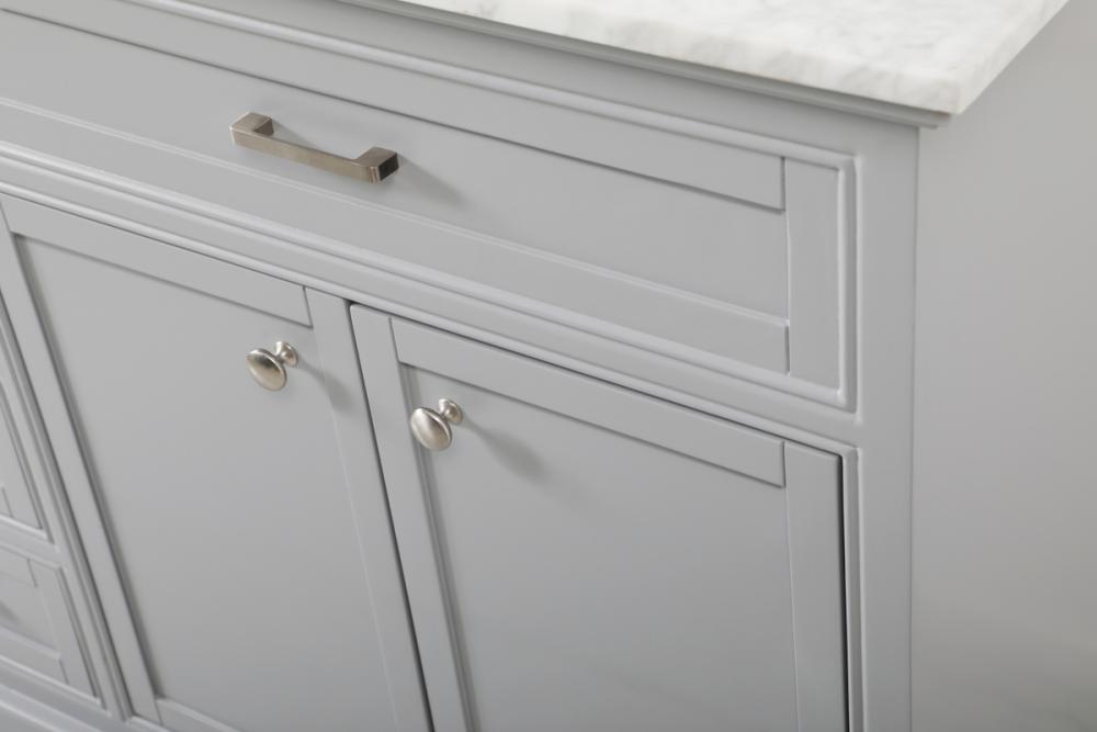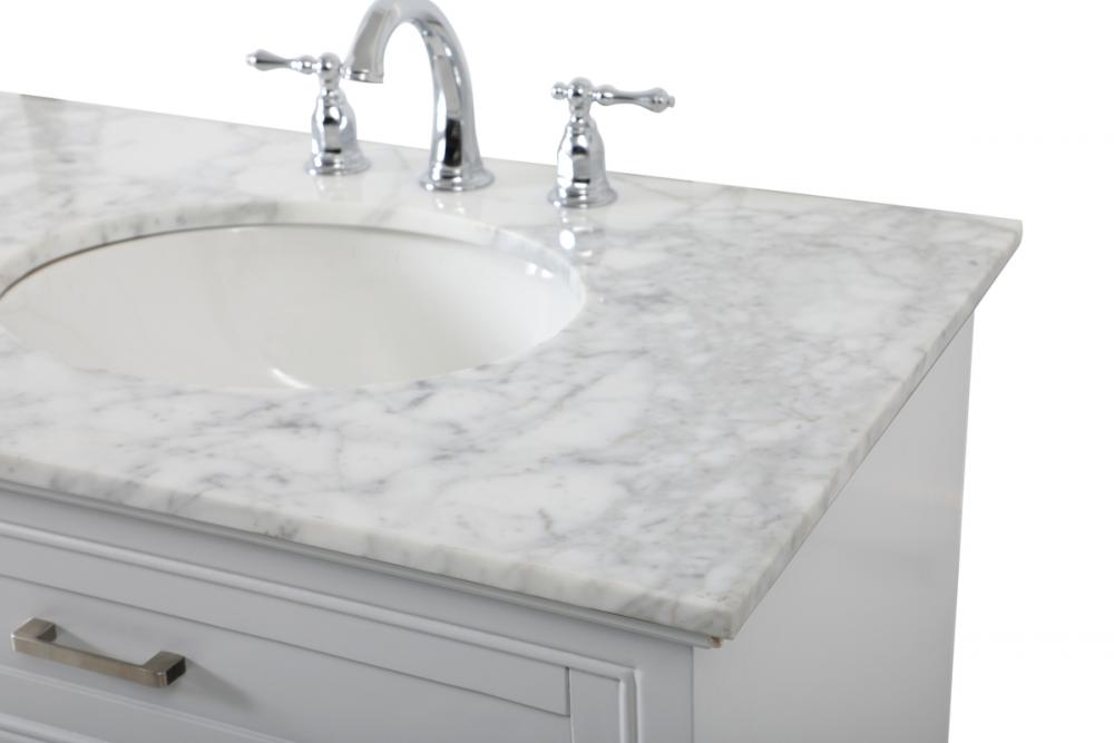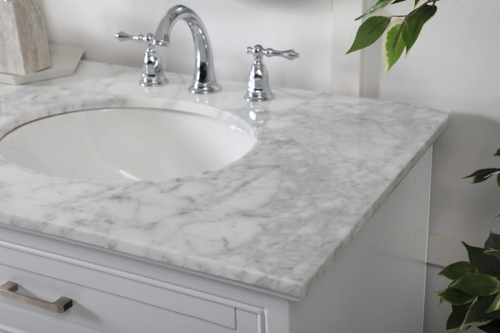 Clean lines and classic form can truly add a fresh look to your bathroom or powder room. This vanity, complemented by round hardware, will surely charm you with its confident style and subtle charisma. This vanity can store all of your bathroom toiletries, from extra towels to make up essentials. The vanity is crowned with carrara white marble and includes a porcelain undermount sink--adding both function and form that will truly amaze.
