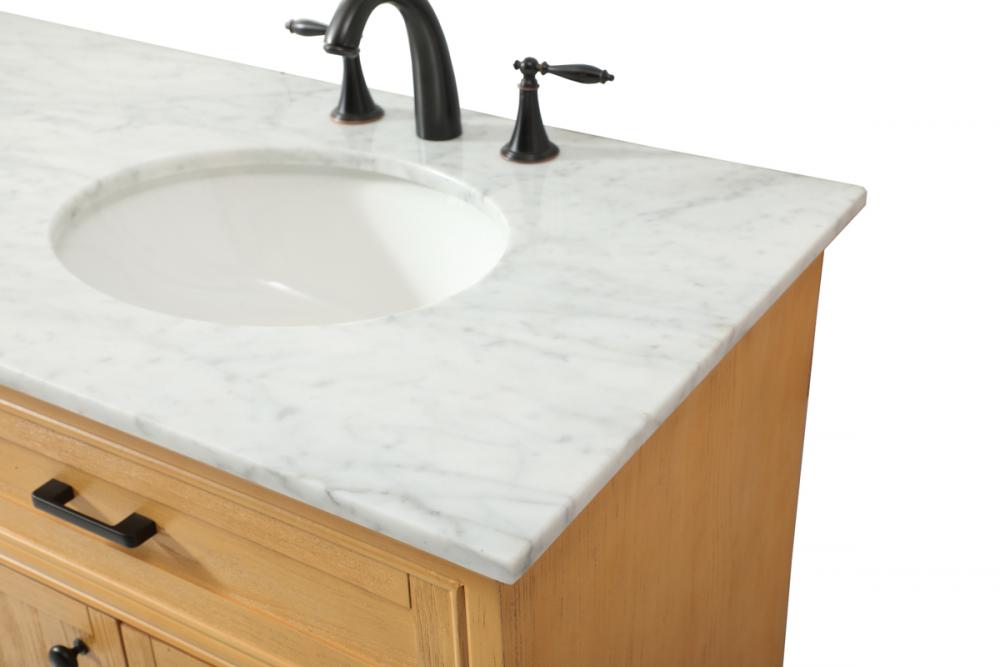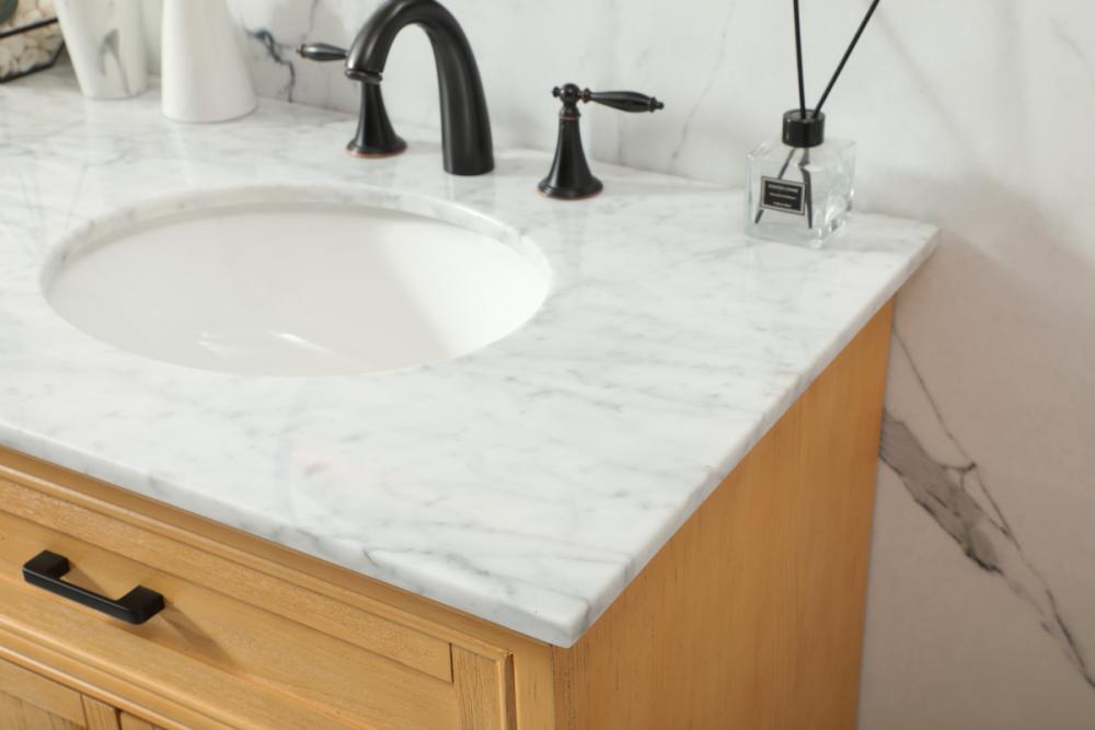 Clean lines and classic form can truly add a fresh look to your bathroom or powder room. This vanity, complemented by round hardware, will surely charm you with its confident style and subtle charisma. This vanity can store all of your bathroom toiletries, from extra towels to make up essentials. The vanity is crowned with carrara white marble and includes a porcelain undermount sink--adding both function and form that will truly amaze.