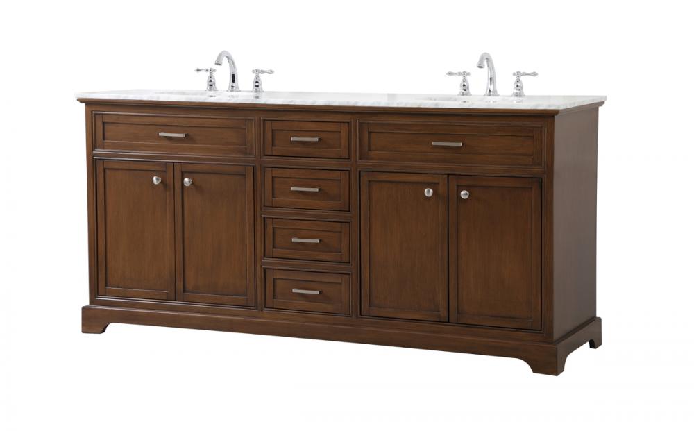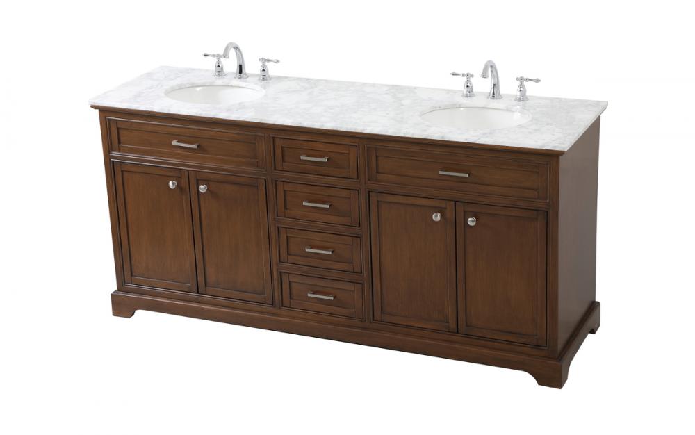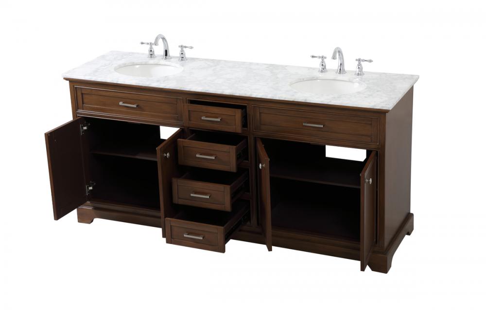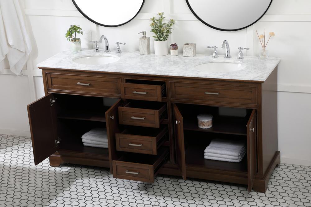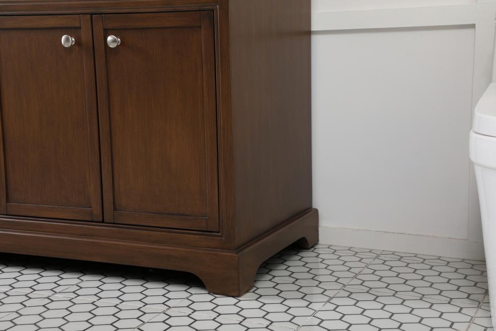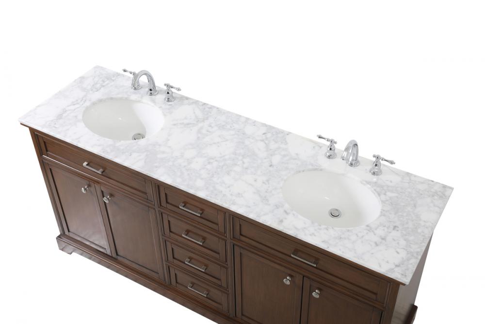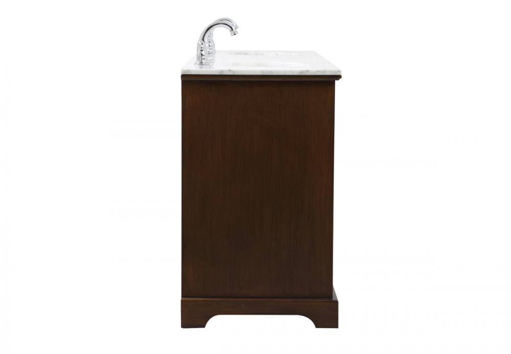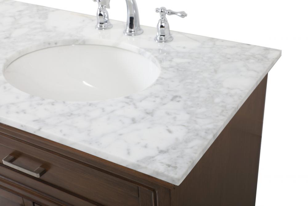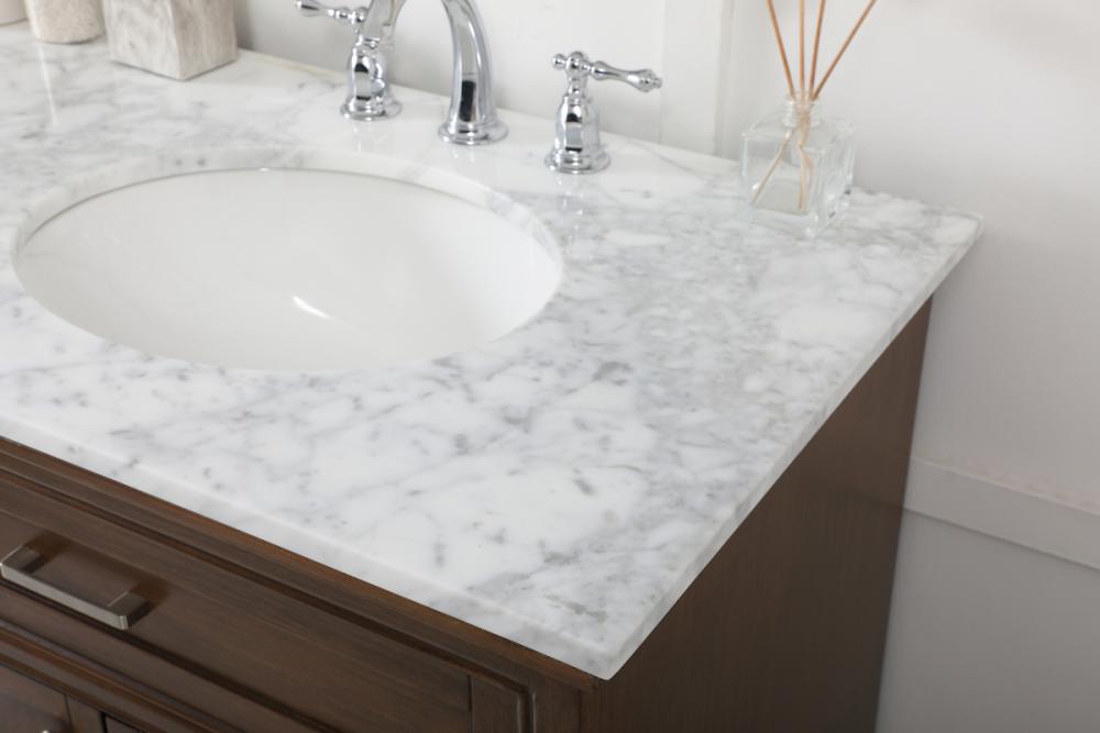 Comes with an undermount porcelain sink and a carrara white marble countertop