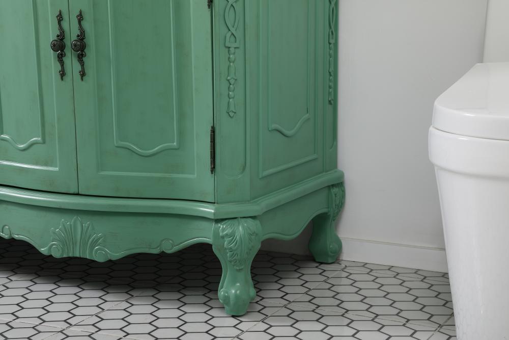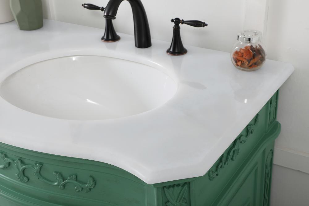 This superb balance of timeless tradition and opulent beauty in a engineered marble-topped vanity will certainly enhance the aesthetics of any home or office bathroom! Featuring an ivory white durable engineered marble countertop complimenting the hand painted cabinet with a delicate carved floral design, stands on stylishly carved solid wood French scroll feet. Don't let the design fool you, the engineered marble countertop and porcelain undermount sink allows for space to get ready, while the antique bronze hardware allows you to discover storage spaces with ease. You and your guests will marvel at this vanity that will both store away your bathroom essentials and enhance the aesthetics of your room.