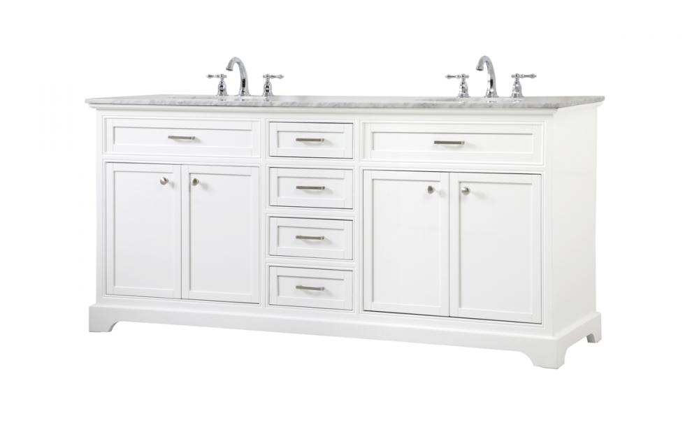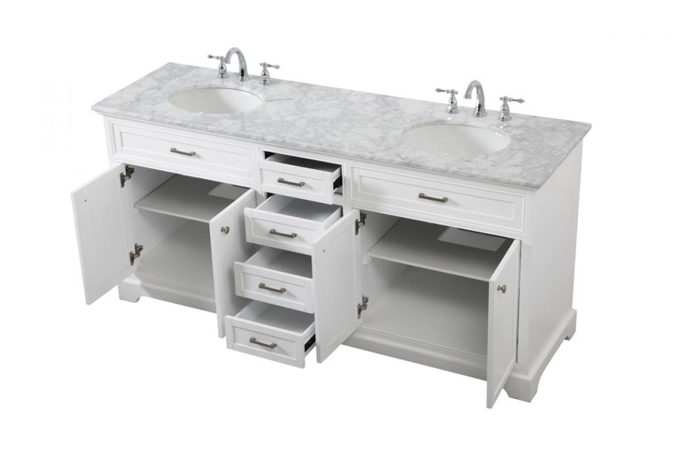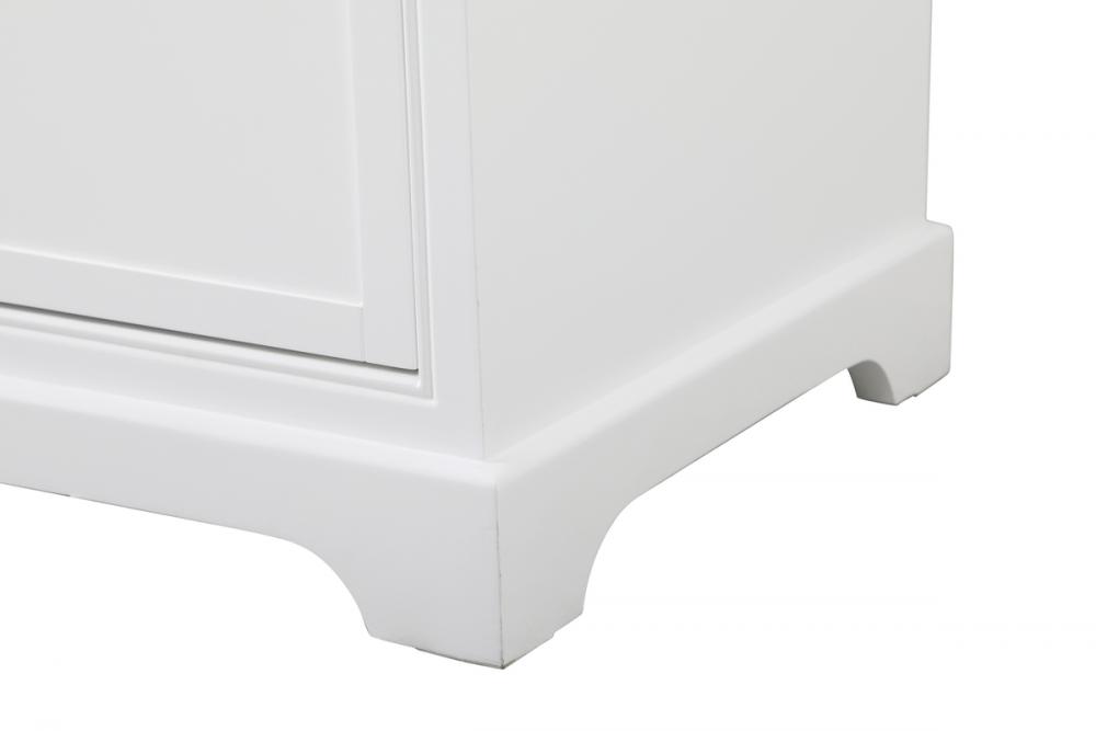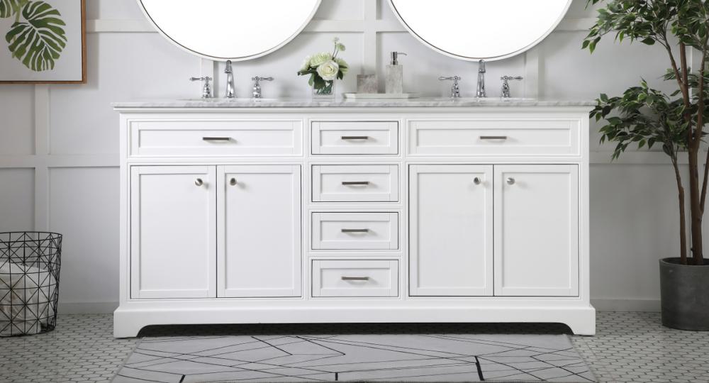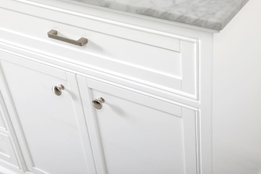 Clean lines and classic form can truly add a fresh look to your bathroom or powder room. This vanity, complemented by round hardware, will surely charm you with its confident style and subtle charisma. This vanity can store all of your bathroom toiletries, from extra towels to make up essentials. The vanity is crowned with carrara white marble and includes a porcelain undermount sink--adding both function and form that will truly amaze.