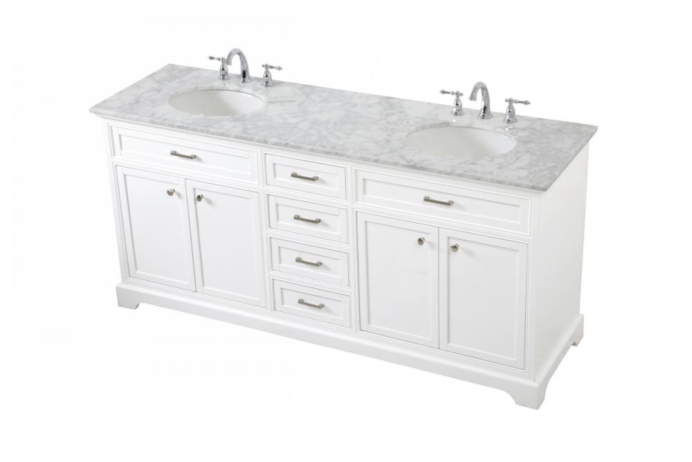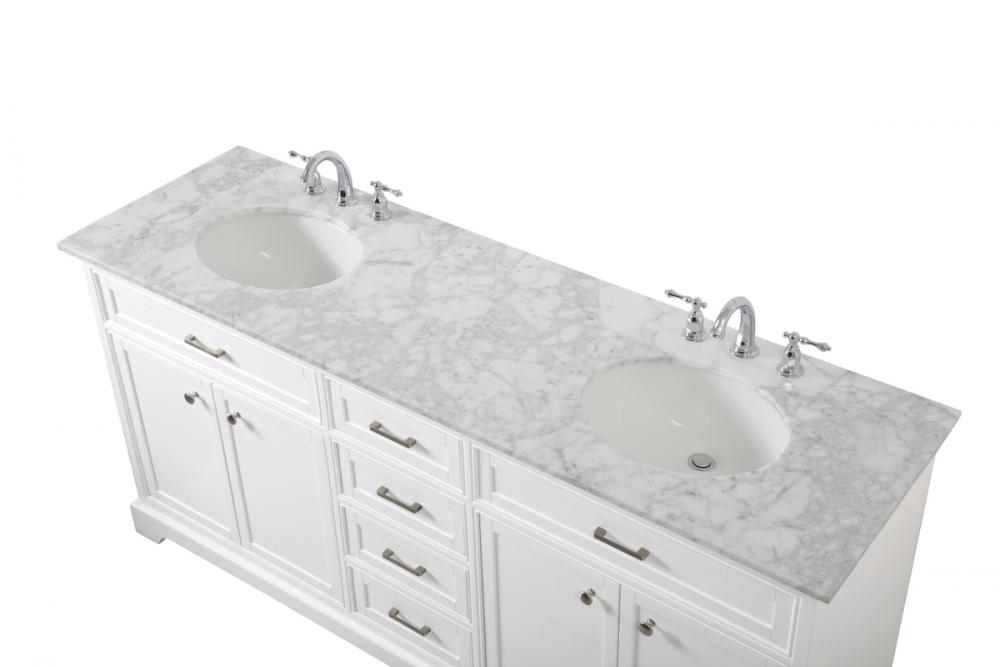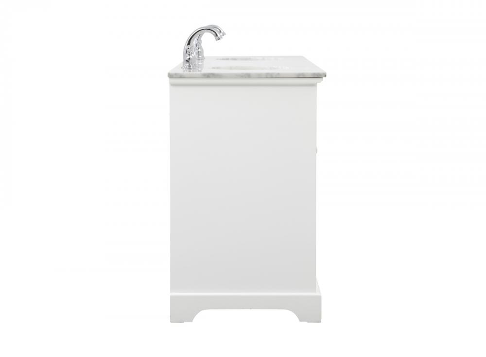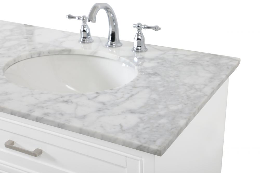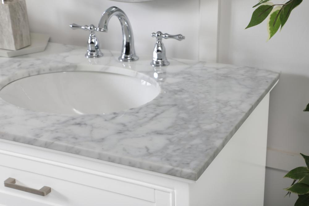 Comes with an undermount porcelain sink and a carrara white marble countertop