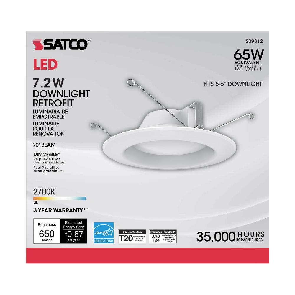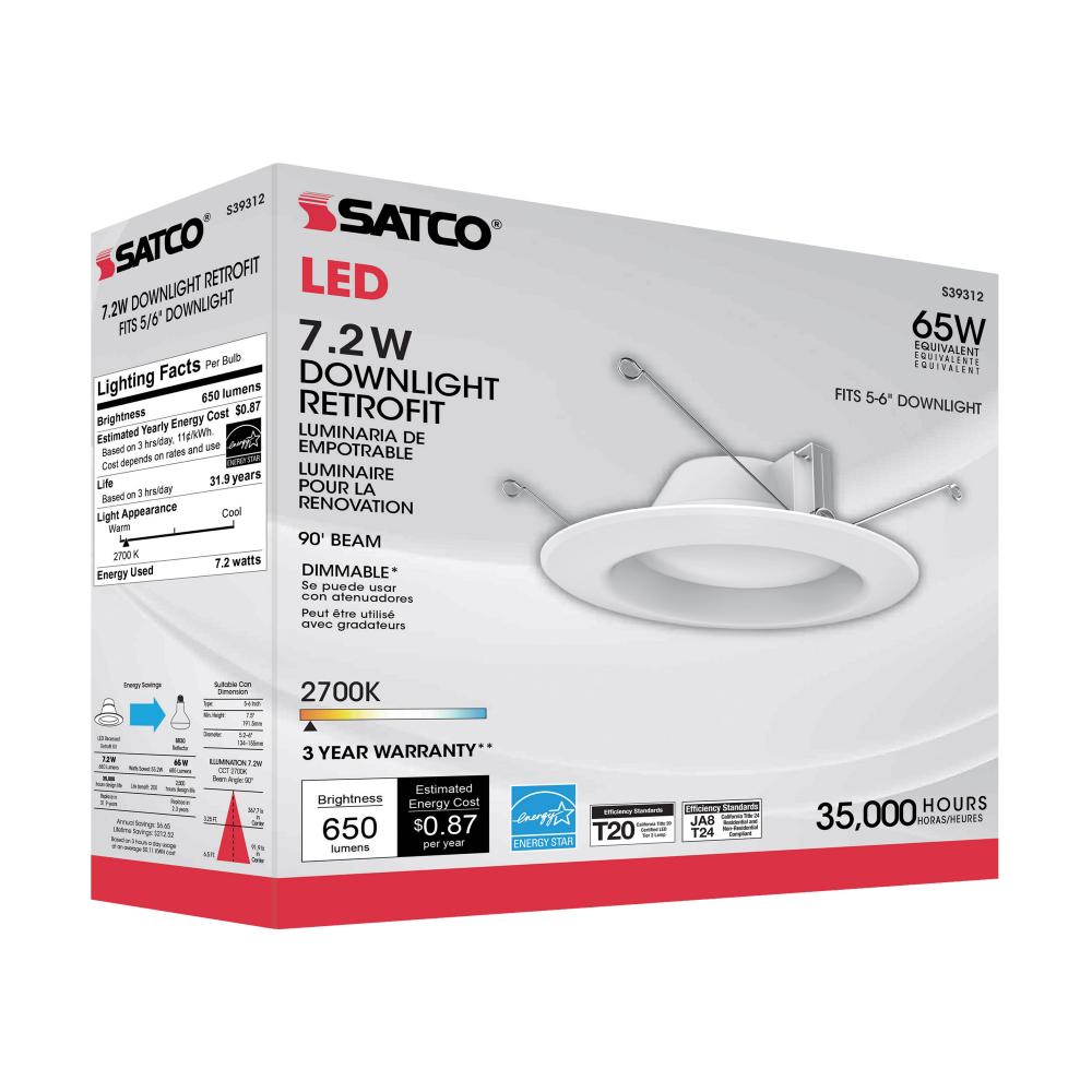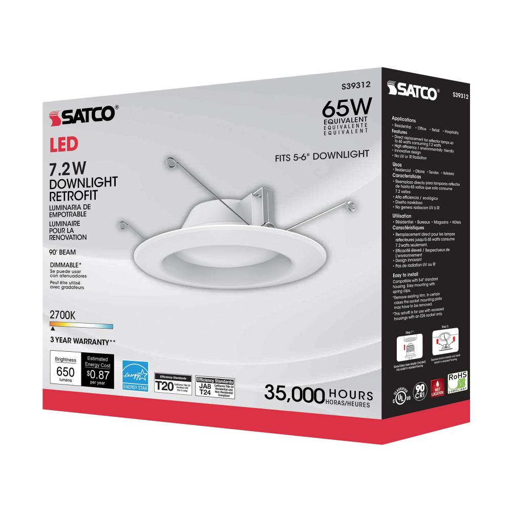 Elevate your lighting with SATCO NUVO's S39312 LED Retrofit Downlight, designed with impeccable color rendering. This retrofit is 7.2-watts with a beam spread of 90 degrees and a color rendering temperature of 2700K, making it the perfect upgrade for e