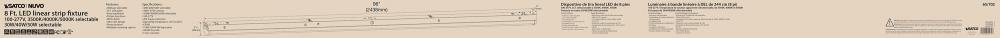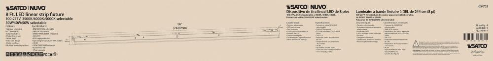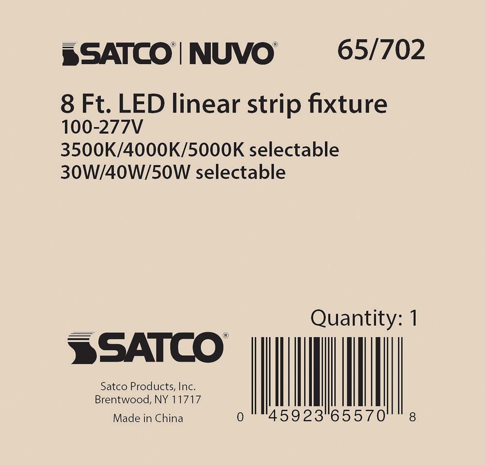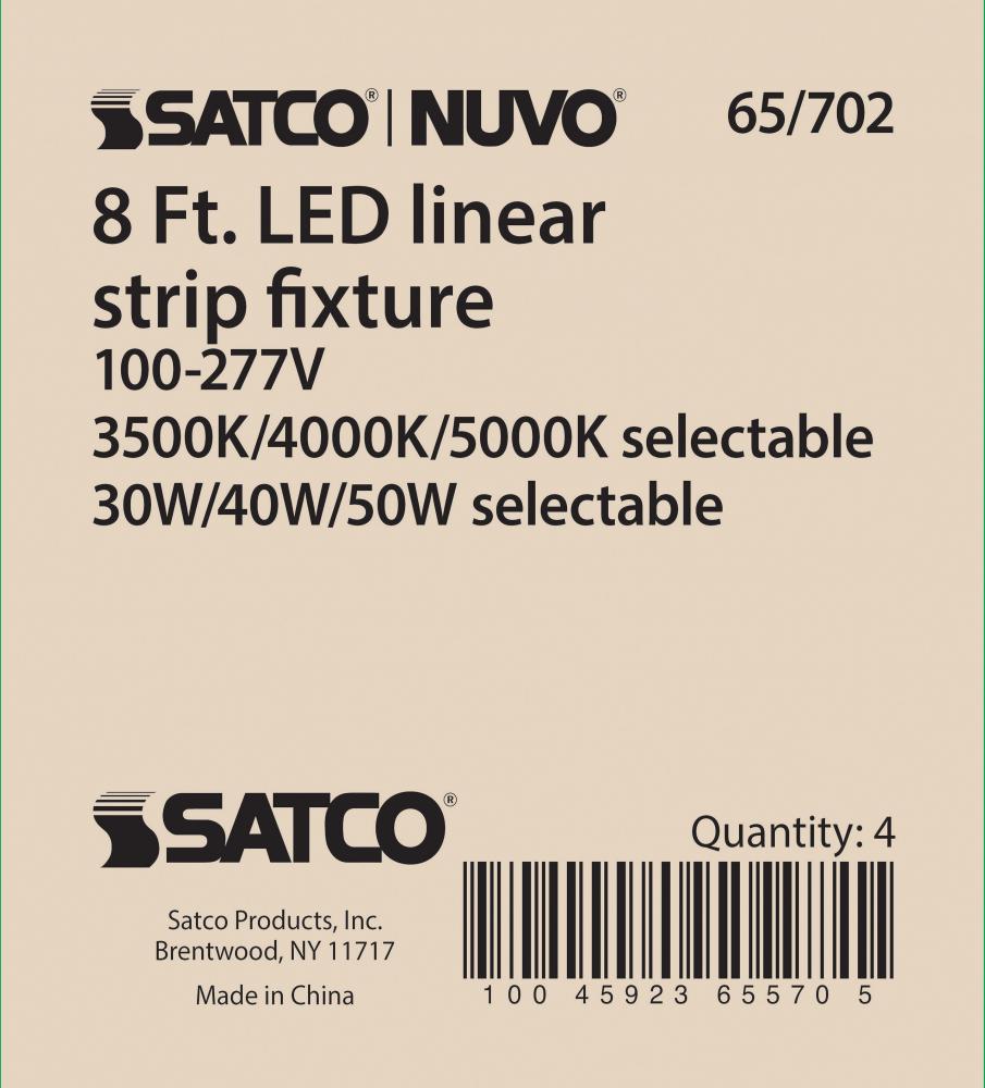 SATCO NUVO's 65-702 8-foot LED Linear Strip Fixture offers adaptable lighting for diverse applications. This field-selectable fixture provides wattage options of 30W, 40W, or 50W and color temperature settings of 3500K, 4000K, or 5000K. With a universa