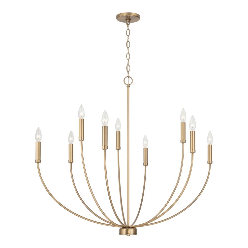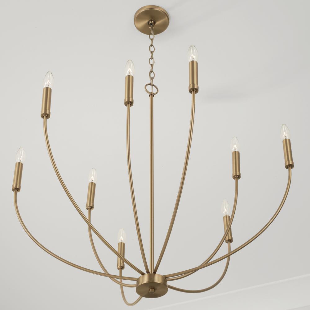 The Ansley 9-Light Chandelier for HomePlace brings a classic shape refreshed with sleek contours and sweeping curves. The elongated arms create dimension, while the open silhouette invites standout style that doesn't overpower. Finished in Aged Brass for a nod to mid-century style.