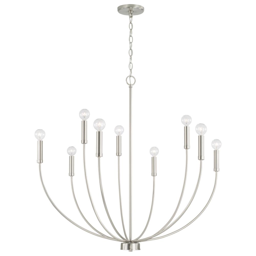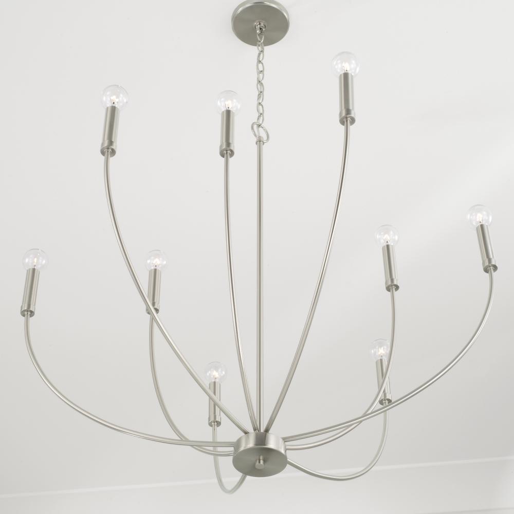 The Ansley 9-Light Chandelier for HomePlace brings a classic shape refreshed with sleek contours and sweeping curves. The elongated arms create dimension, while the open silhouette invites standout style that doesn't overpower. Finished in Brushed Nickel for a versatile look.