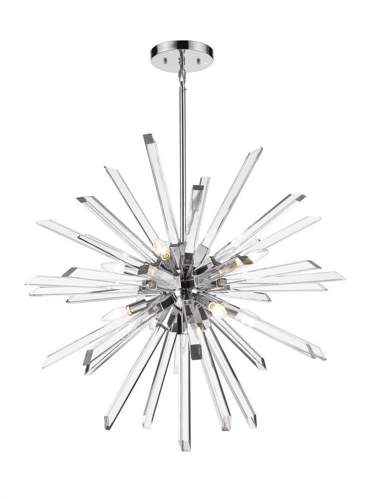 Long rods of glittering K5 crystal create a dimensional sunburst effect for this eight-light pendant. Complete with a straight suspension rod and a chrome accent finish, this dynamic design adds luxury and energy to a dining room or entry.