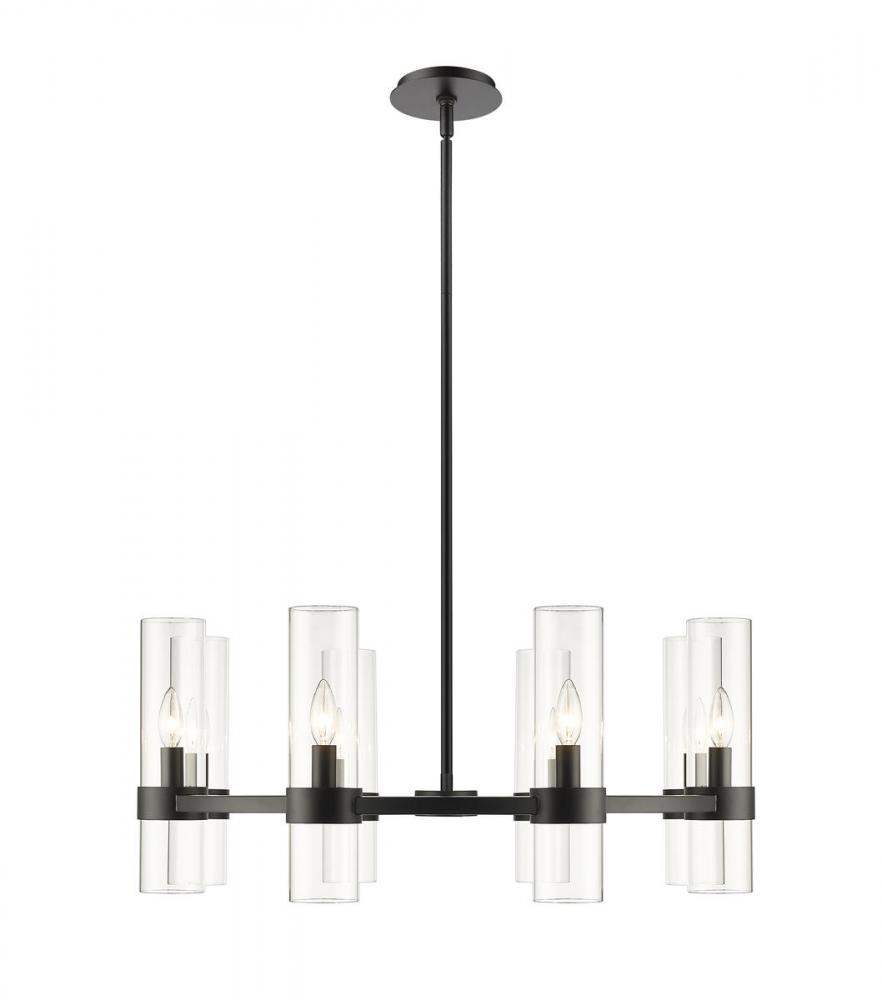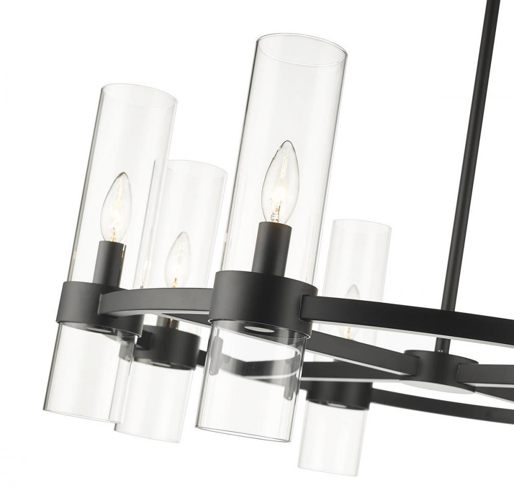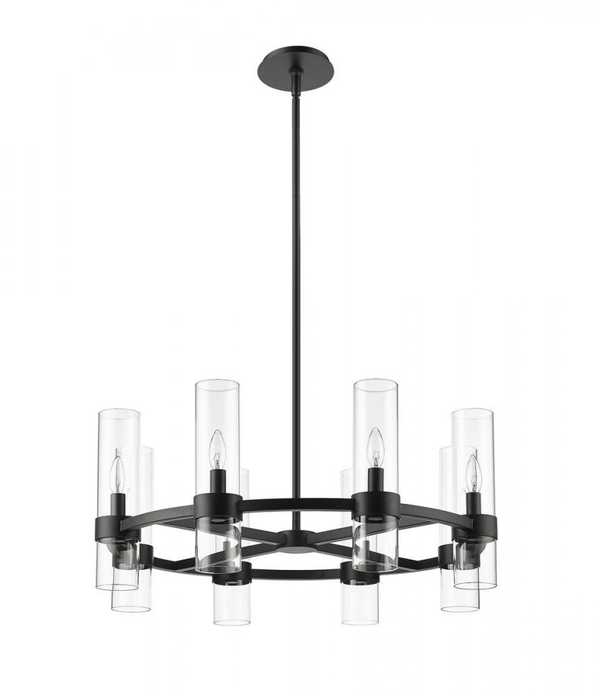 Distinctive modern style takes a page from industrial-inspired flavor, creating a captivating fixture blending matte black steel and glass. With a circular spoke-style frame, the Datus eight-light chandelier lends a minimalist approach to lighting with enough glam to stand out. Perfect for a small- to mid-sized contemporary dining room, kitchen, or hallway, this chandelier delivers drama with a round frame crafted of bold matte black finish iron, dressed up with delicate clear glass cylinder shades.