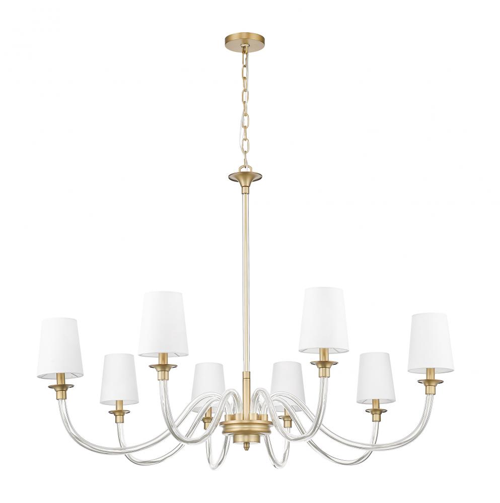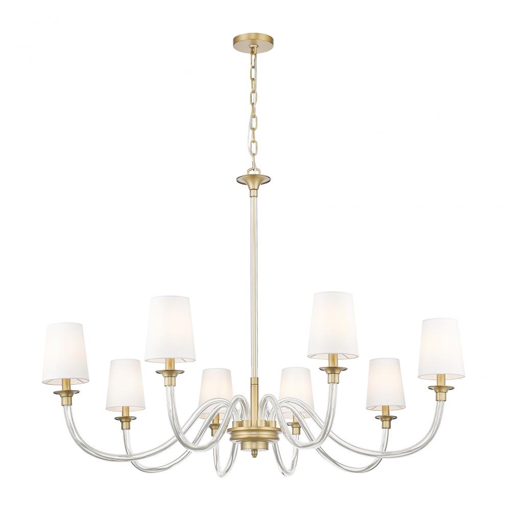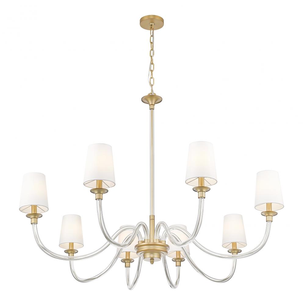 Elegant touches of rich rubbed brass finishing create warmth and contrast for this modern eight-light chandelier. Delicate glass arms are curved and slim, offering refined flair to a familiar silhouette. Lights are capped with white fabric shades, each with a slight taper for added elegance.