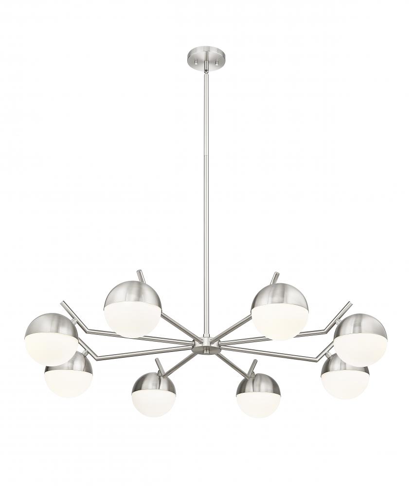 Set the stage for contemporary elegance with this modern eight-light chandelier. It showcases a clean-lined profile emphasized with its brushed nickel finish. Orb shades in matte opal glass cast inviting illumination, perfect for a welcoming kitchen or dining room table.