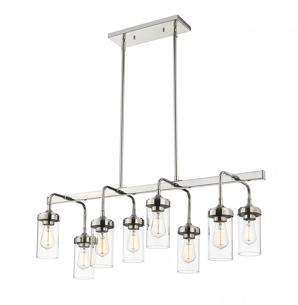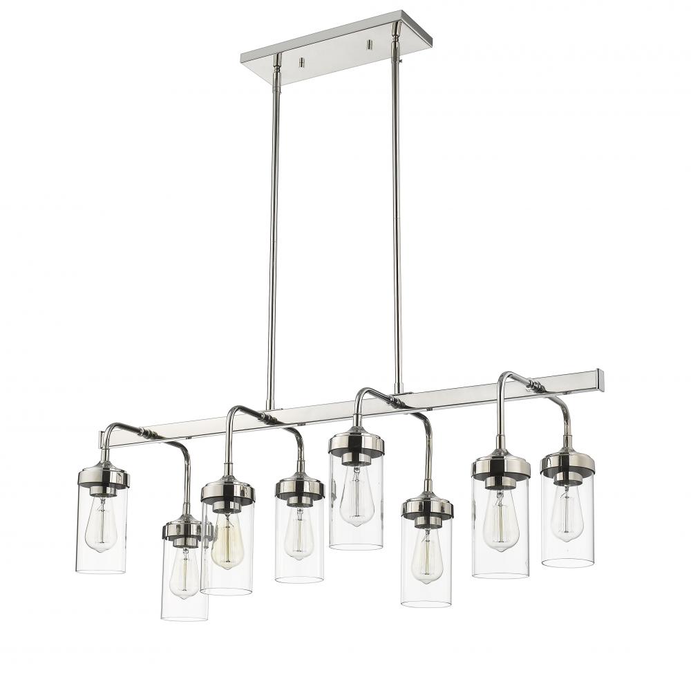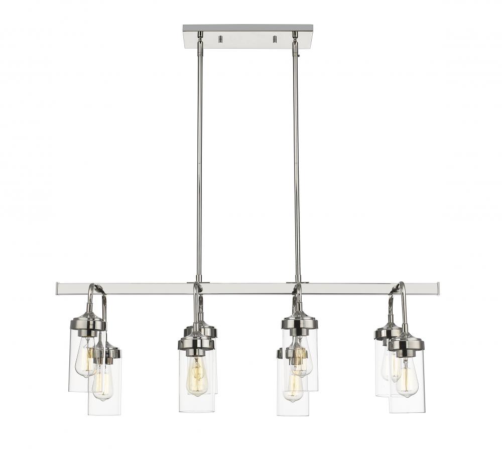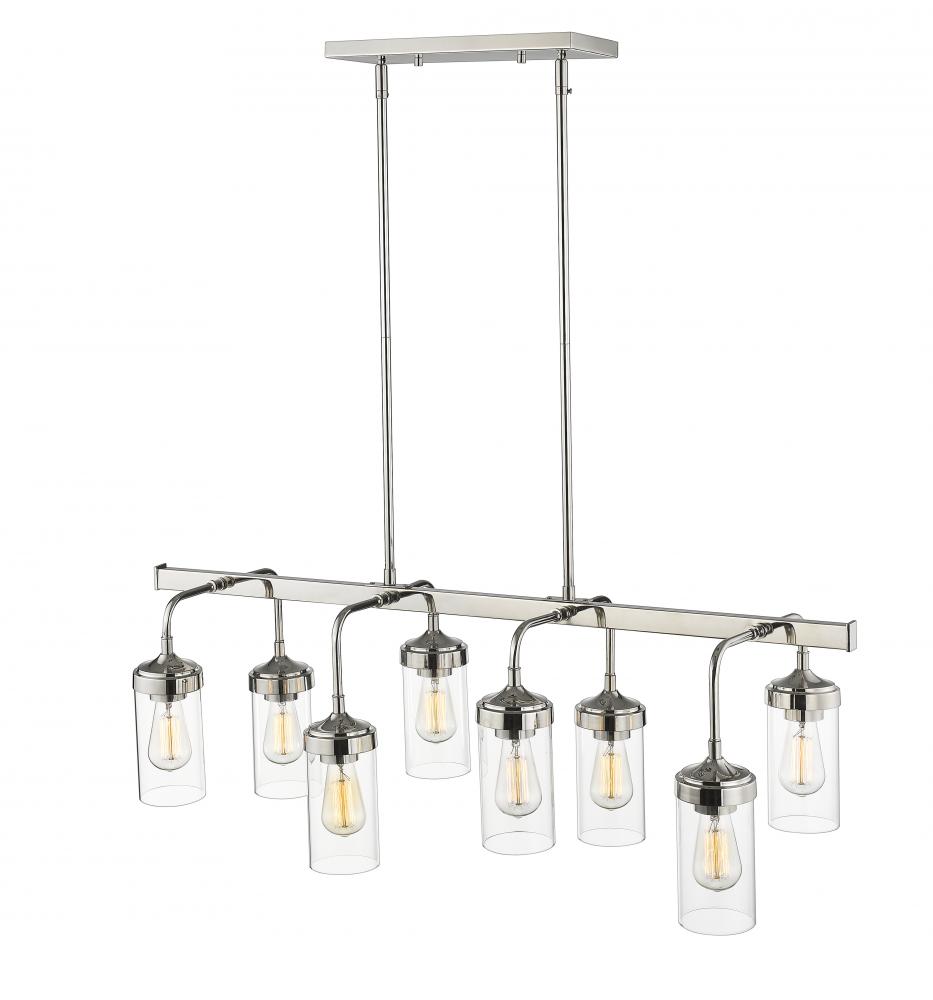 Frame a kitchen island or entertainment bar in sleek style with this elegant fixture. Updating a beloved industrial motif, this eight-light island pendant offers brightly polished nickel steel as a frame for clear glass cylinder shades.